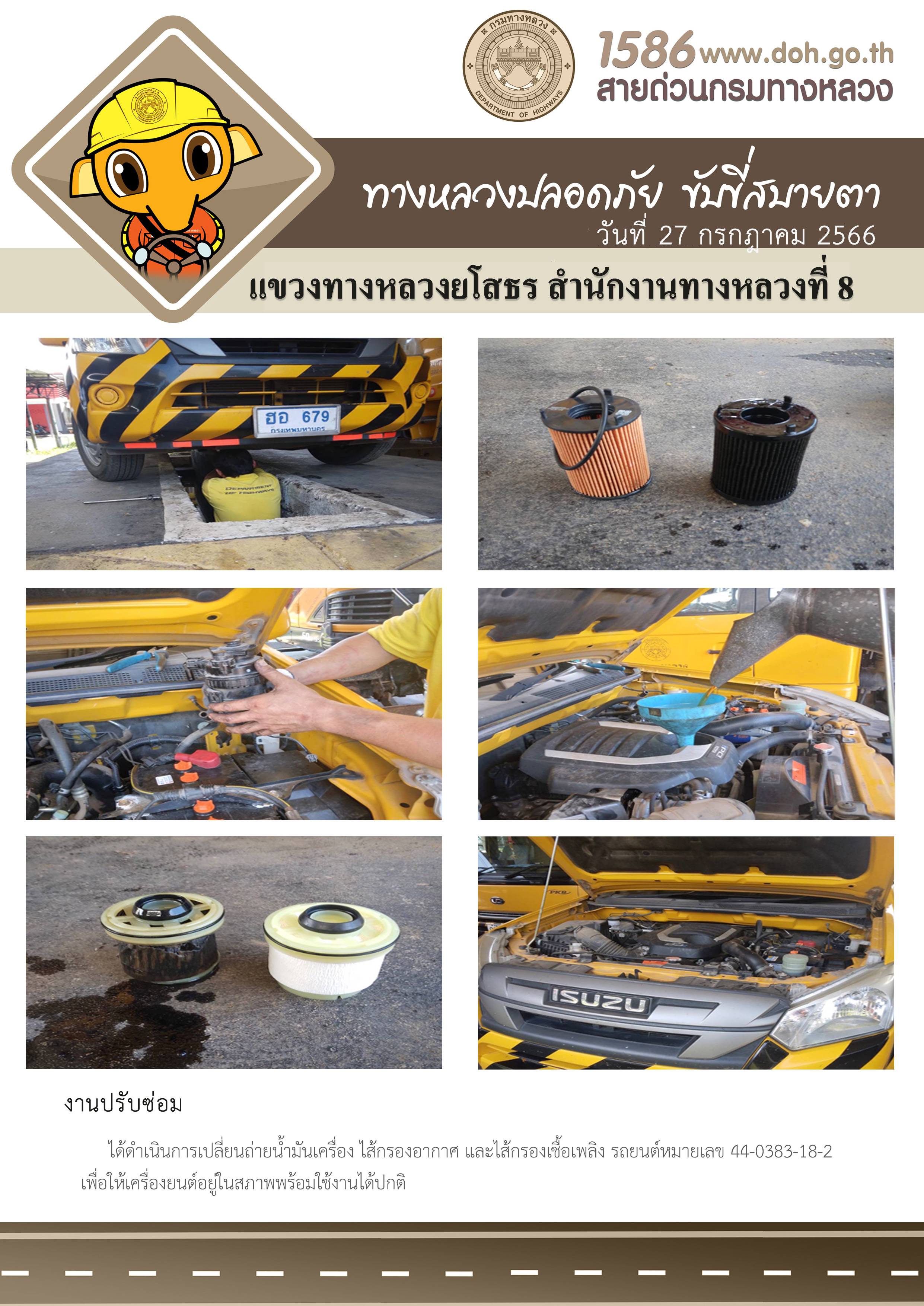 วันที่ 27 กรกฎาคม 2566 งานปรับซ่อม ได้ดำเนินการเปลี่ยนถ่ายน้ำมันเครื่อง ไส้กรองอากาศ และไส้กรองเชื้อเพลิง รถยนต์หมายเลข 44-0383-18-2 เพื่อให้เครื่องยนต์อยู่ในสภาพพร้อมใช้งานได้ปกติ