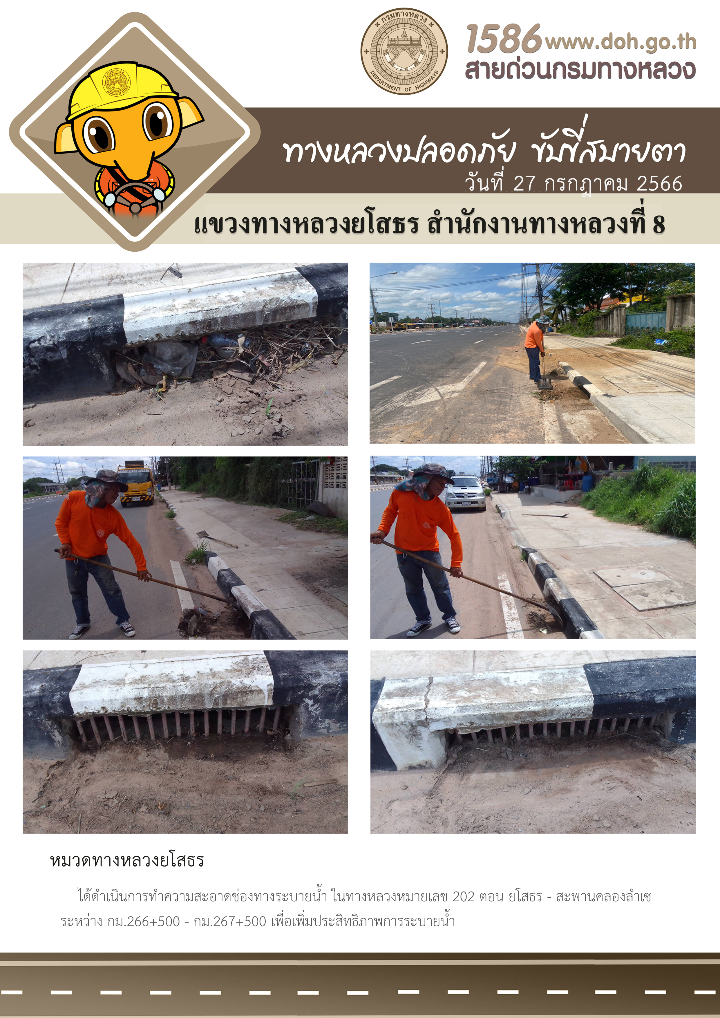 วันที่ 27 กรกฎาคม 2566 หมวดทางหลวงยโสธร ได้ดำเนินการทำความสะอาดช่องทางระบายน้ำ ในทางหลวงหมายเลข 202 ตอน ยโสธร - สะพานคลองลำเซ ระหว่าง กม.266+500 - กม.267+500 เพื่อเพิ่มประสิทธิภาพการระบายน้ำ