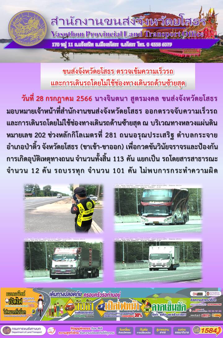 วันที่ 28 กรกฎาคม 2566 เจ้าหน้าที่สำนักงานขนส่งจังหวัดยโสธร ออกตั้งจุดตรวจจับความเร็ว