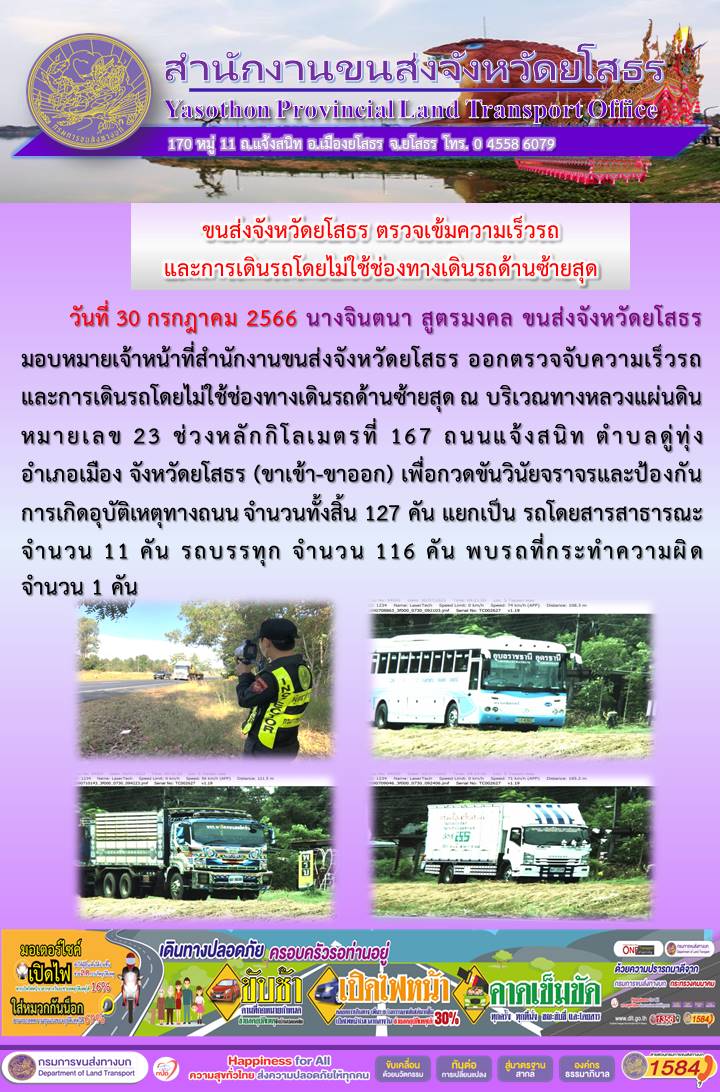 วันที่ 30 กรกฎาคม 2566 เจ้าหน้าที่สำนักงานขนส่งจังหวัดยโสธร ออกตั้งจุดตรวจจับความเร็ว