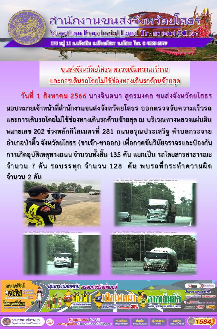 วันที่ 1 สิงหาคม 2566 เจ้าหน้าที่สำนักงานขนส่งจังหวัดยโสธร ออกตั้งจุดตรวจจับความเร็ว