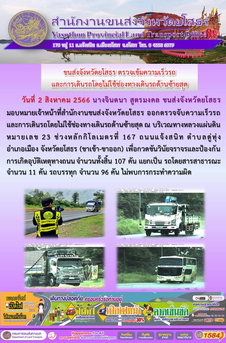 วันที่ 2 สิงหาคม 2566 เจ้าหน้าที่สำนักงานขนส่งจังหวัดยโสธร ออกตั้งจุดตรวจจับความเร็ว