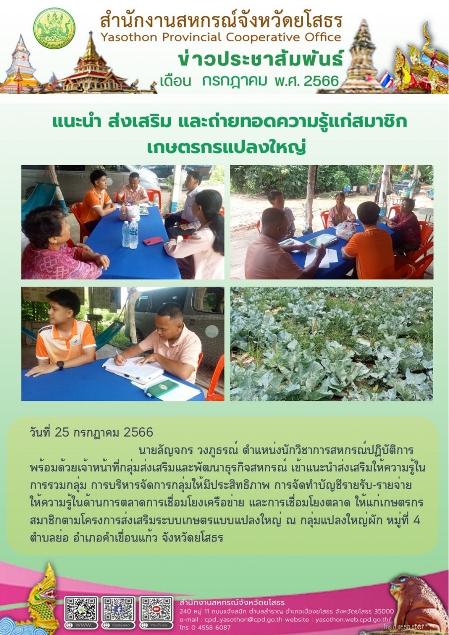 นายลัญจกร วงภูธรณ์ นักวิชาการสหกรณ์ปฏิบัติการ พร้อมด้วยเจ้าหน้าที่สำนักงานสหกรณ์จังหวัดยโสธร เข้าแนะนำส่งเสริมให้ความรู้ในการรวมกลุ่ม การบริหารจัดการกลุ่มให้มีประสิทธิภาพ ณ กลุ่มแปลงใหญ่ผัก หมู่ที่ 4 ตำบลย่อ อำเภอคำเขื่อนแก้ว