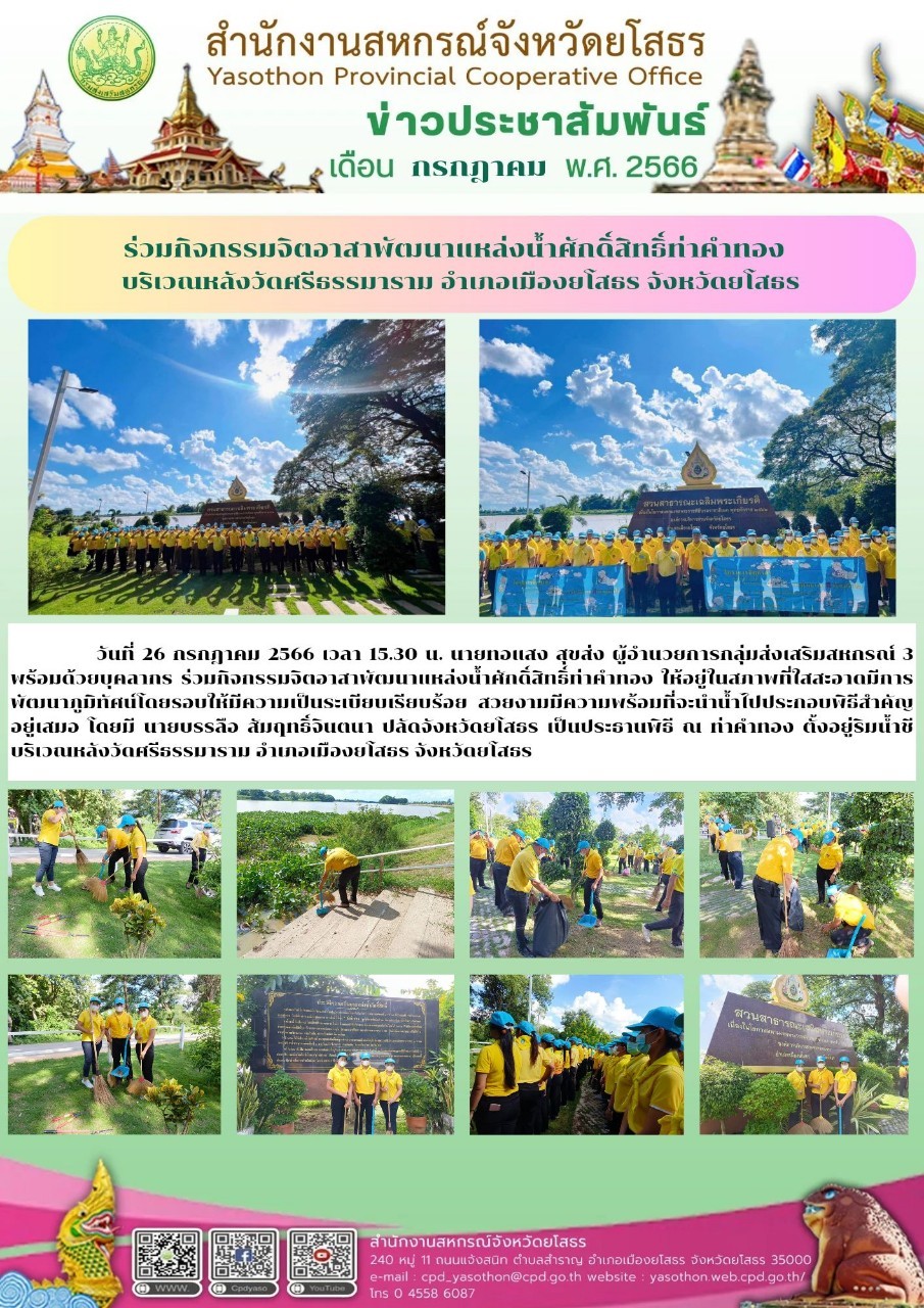 นายทอแสง สุขส่ง ผู้อำนวยการกลุ่มส่งเสริมสหกรณ์ 3 พร้อมด้วยเจ้าหน้าที่สำนักงานสหกรณ์จังหวัดยโสธร ร่วมกิจกรรมจิตอาสาพัฒนาแหล่งน้ำศักดิ์สิทธิ์ท่าคำทอง บริเวณหลังวัดศรีธรรมาราม อำเภอเมืองยโสธร