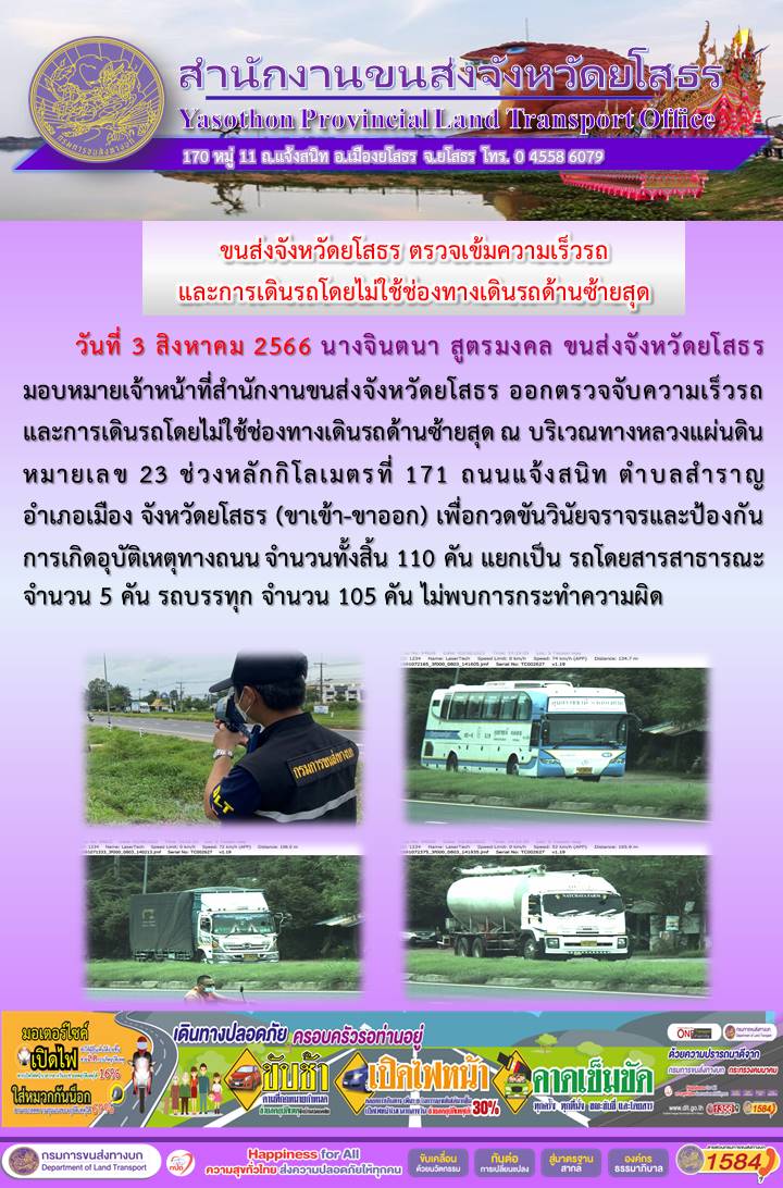 วันที่ 3 สิงหาคม 2566 เจ้าหน้าที่สำนักงานขนส่งจังหวัดยโสธร ออกตั้งจุดตรวจจับความเร็ว