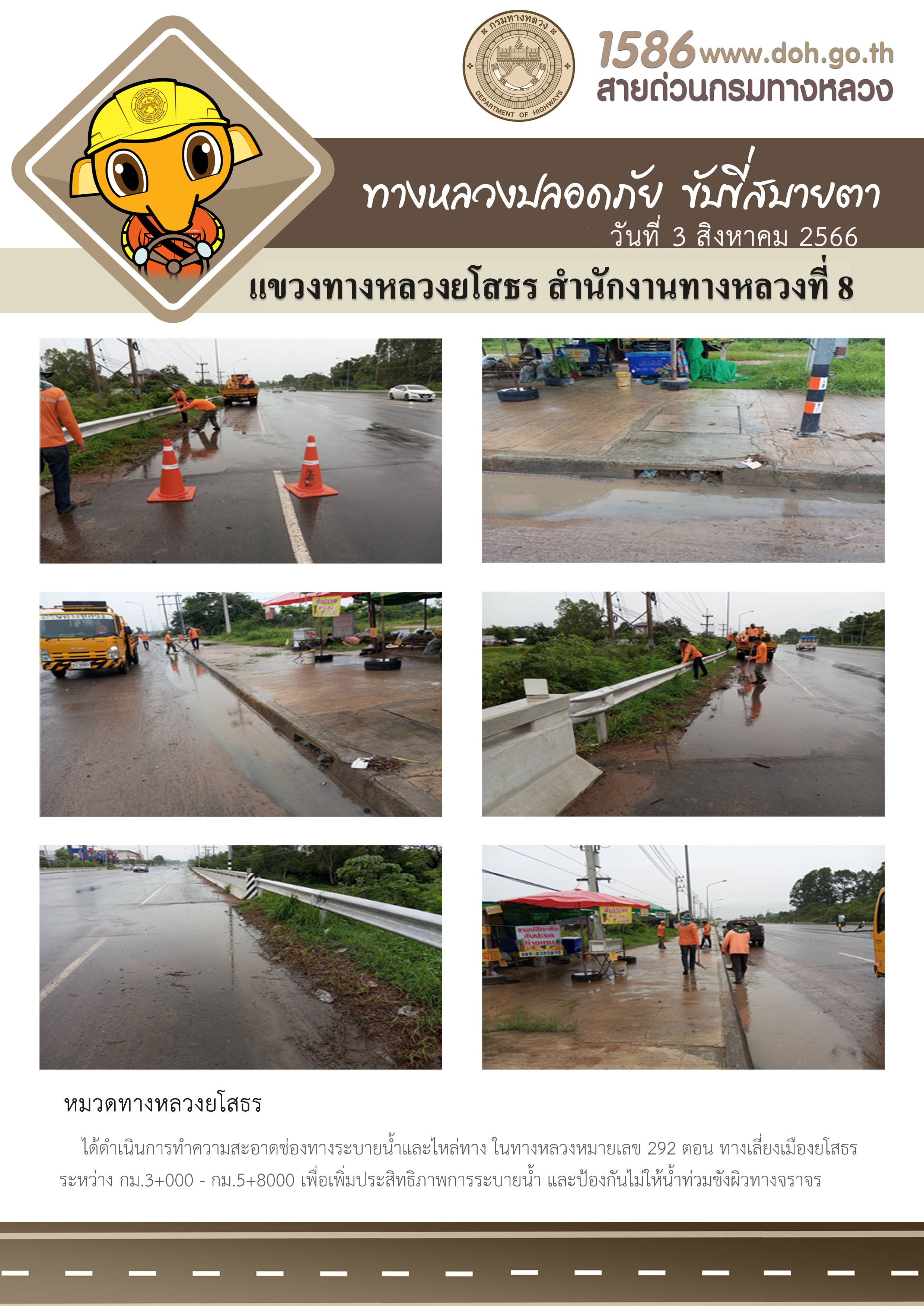 วันที่ 3 สิงหาคม 2566 หมวดทางหลวงยโสธร ได้ดำเนินการทำความสะอาดช่องทางระบายน้ำและไหล่ทาง ในทางหลวงหมายเลข 292 ตอน ทางเลี่ยงเมืองยโสธร ระหว่าง กม.3+000 - กม.5+800 เพื่อเพิ่มประสิทธิภาพการระบายน้ำ และป้องกันไม่ให้น้ำท่วมขังผิวทางจราจร
