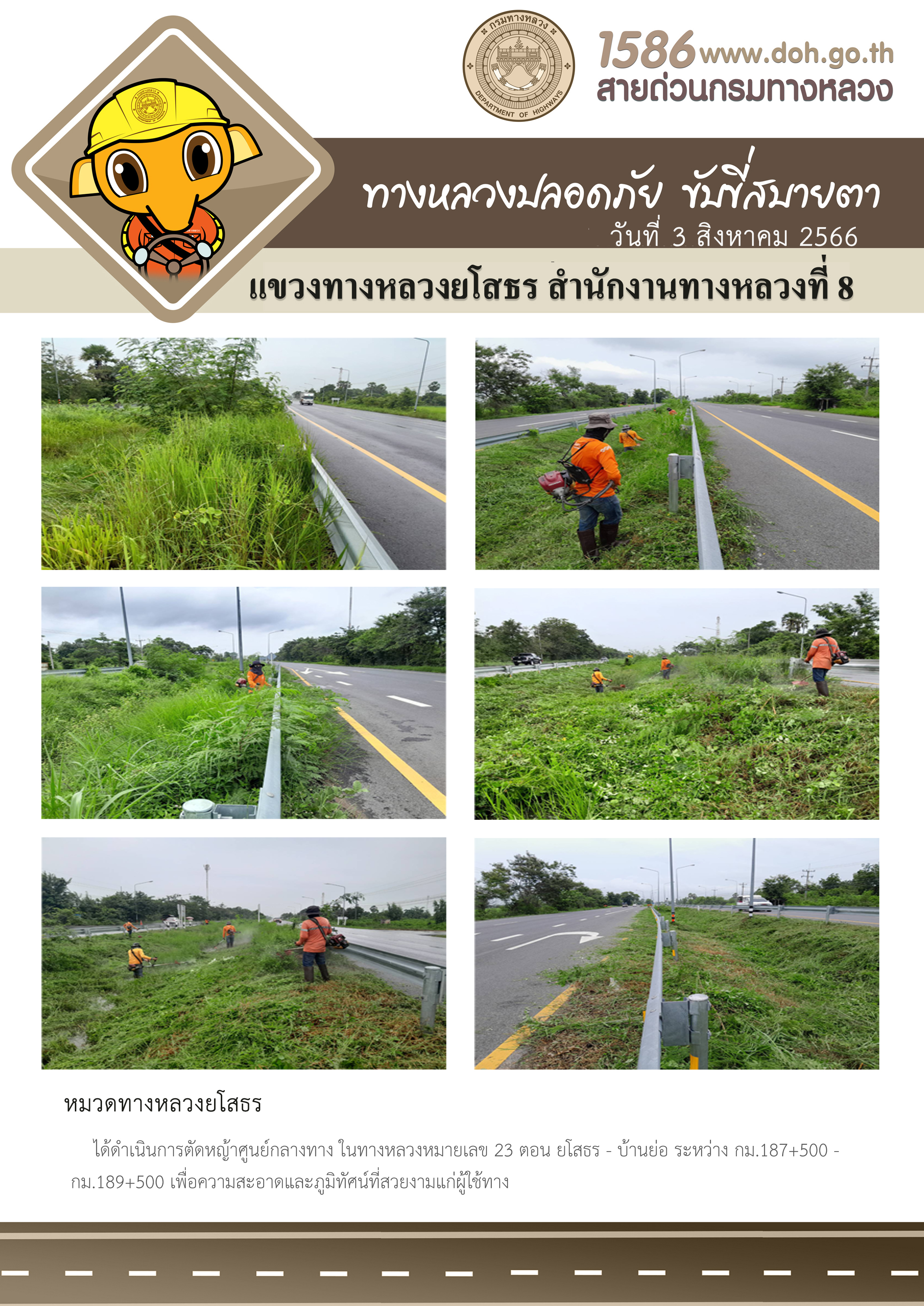 วันที่ 3 สิงหาคม 2566 หมวดทางหลวงยโสธร ได้ดำเนินการตัดหญ้าศูนย์กลางทาง ในทางหลวงหมายเลข 23 ตอน ยโสธร - บ้านย่อ ระหว่าง กม.187+500 - กม.189+500 เพื่อความสะอาดและภูมิทัศน์ที่สวยงามแก่ผู้ใช้ทาง