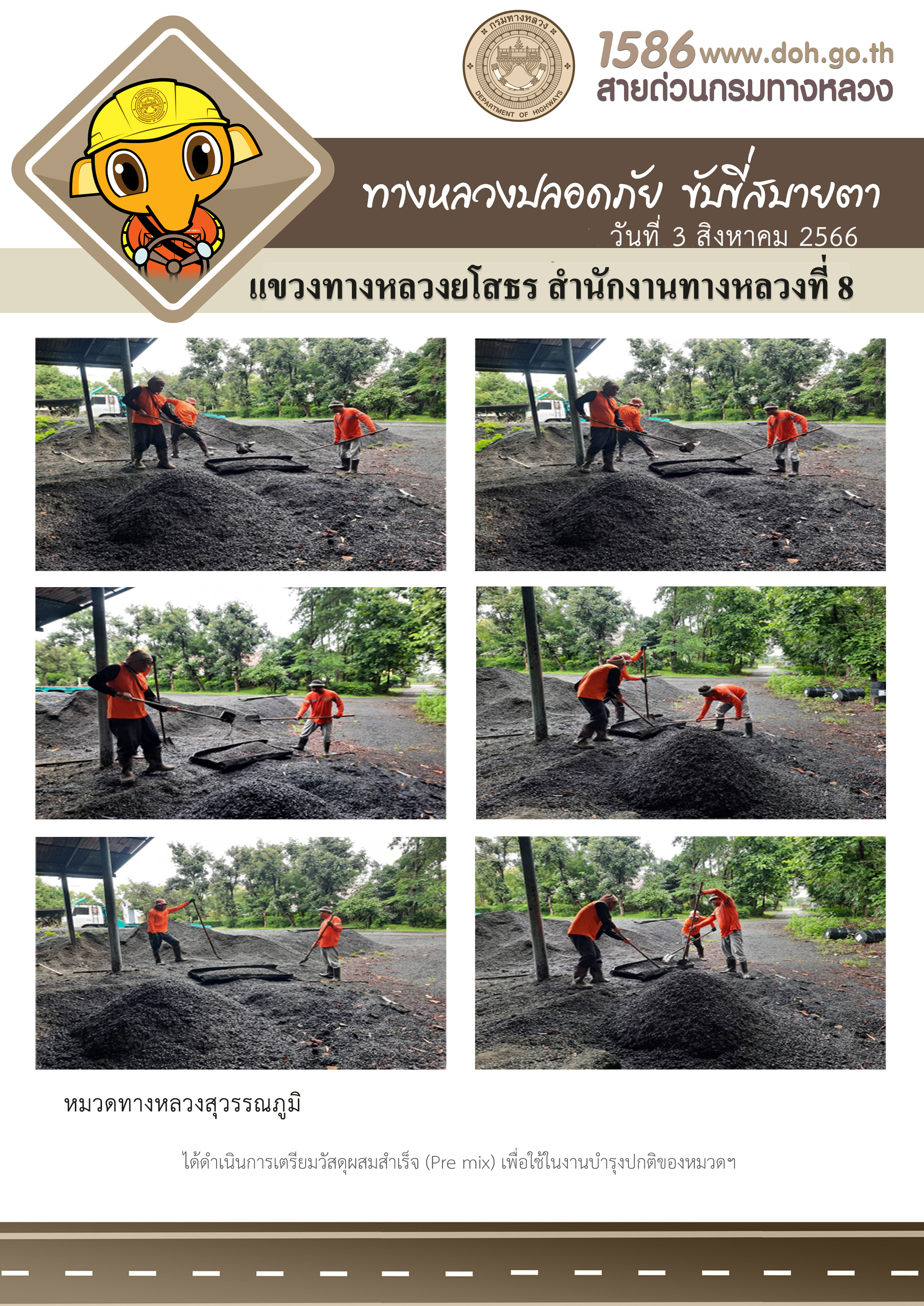 วันที่ 3 สิงหาคม 2566 หมวดทางหลวงสุวรรณภูมิ ได้ดำเนินการเตรียมวัสดุผสมสำเร็จ (Pre mix) เพื่อใช้ในงานบำรุงปกติของหมวดฯ