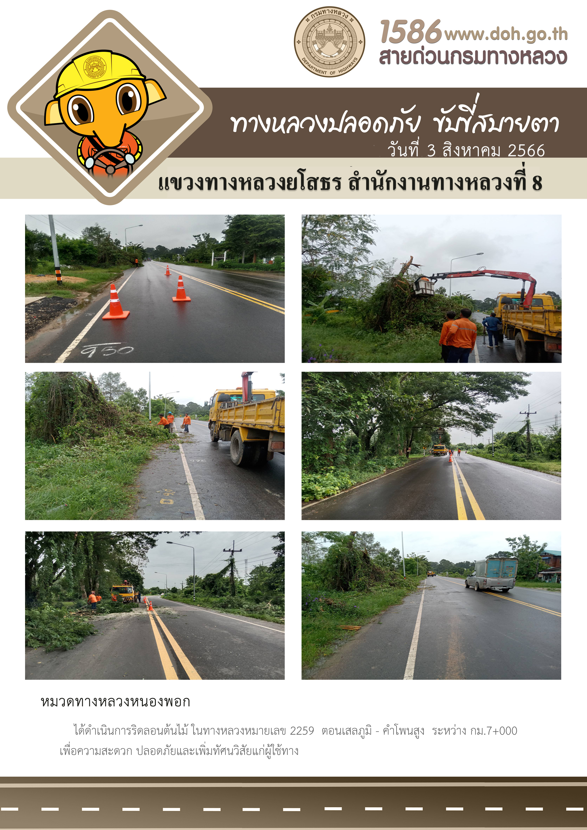 วันที่ 3 สิงหาคม 2566 หมวดทางหลวงหนองพอก ได้ดำเนินการริดลอนต้นไม้ ในทางหลวงหมายเลข 2259 ตอนเสลภูมิ - คำโพนสูง ระหว่าง กม.7+000 เพื่อความสะดวก ปลอดภัยและเพิ่มทัศนวิสัยแก่ผู้ใช้ทาง