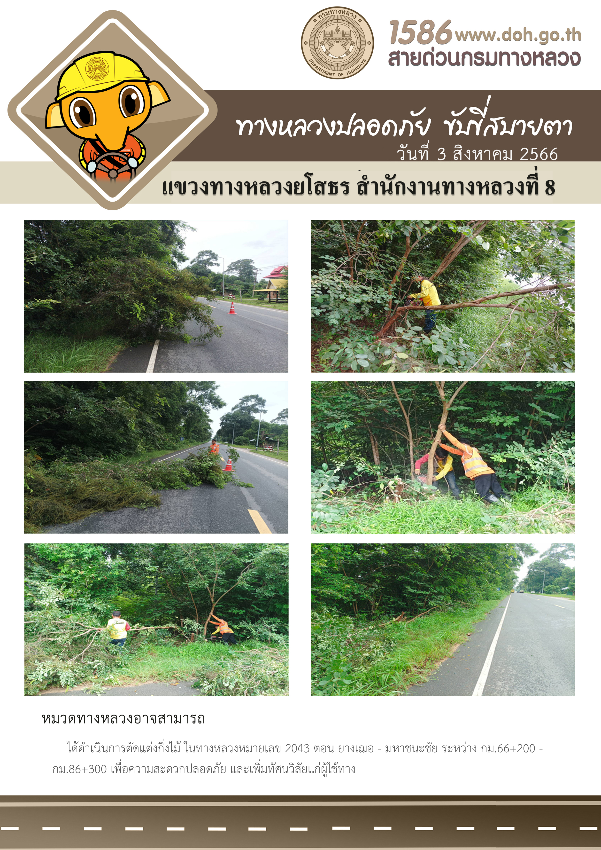 วันที่ 3 สิงหาคม 2566 หมวดทางหลวงอาจสามารถ ได้ดำเนินการตัดแต่งกิ่งไม้ ในทางหลวงหมายเลข 2043 ตอน ยางเฌอ - มหาชนะชัย ระหว่าง กม.66+200 - กม.86+300 เพื่อความสะดวกปลอดภัย และเพิ่มทัศนวิสัยแก่ผู้ใช้ทาง