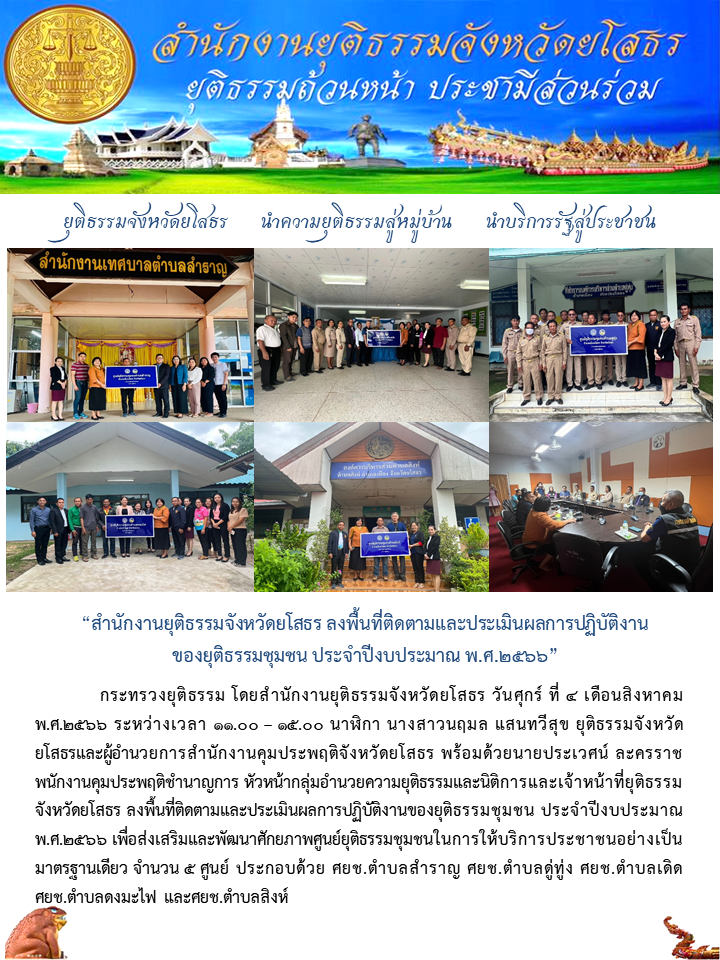 วันที่ 4 ส.ค. 2566 (16:00 น.)กระทรวงยุติธรรม โดยสำนักงานยุติธรรมจังหวัดยโสธร วันศุกร์ ที่ 4 เดือนสิงหาคม พ.ศ.2566 ระหว่างเวลา 11.00 – 15.00 นาฬิกา นางสาวนฤมล แสนทวีสุข ยุติธรรมจังหวัดยโสธรและผู้อำนวยการสำนักงานคุมประพฤติจังหวัดยโสธร พร้อมด้วยนายประเวศน์ ละครราช พนักงานคุมประพฤติชำนาญการ หัวหน้ากลุ่มอำนวยความยุติธรรมและนิติการและเจ้าหน้าที่ยุติธรรมจังหวัดยโสธร ลงพื้นที่ติดตามและประเมินผลการปฏิบัติงานของยุติธรรมชุมชน ประจำปีงบประมาณ พ.ศ.2566 เพื่อส่งเสริมและพัฒนาศักยภาพศูนย์ยุติธรรมชุมชนในการให้บริการประชาชนอย่างเป็นมาตรฐานเดียว จำนวน 5 ศูนย์ ประกอบด้วย ศยช.ตำบลสำราญ ศยช.ตำบลดู่ทู่ง ศยช.ตำบลเดิด ศยช.ตำบลดงมะไฟ และศยช.ตำบลสิงห์ อำเภอเมืองยโสธร จังหวัดยโสธร