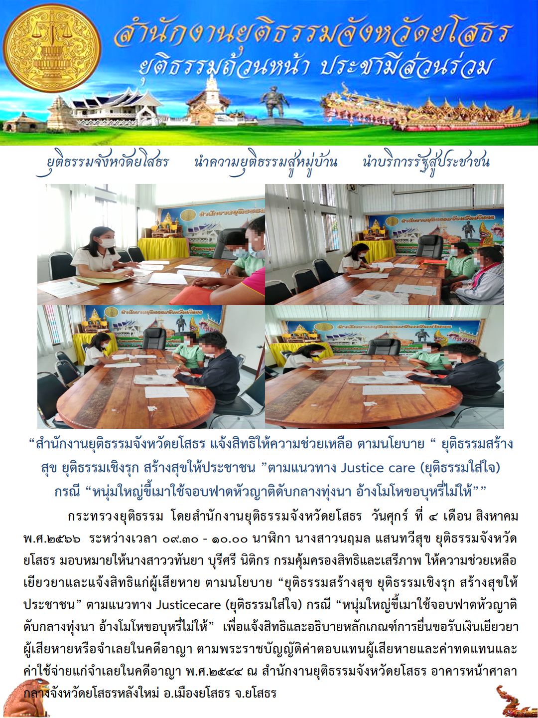 สำนักงานยุติธรรมจังหวัดยโสธร แจ้งสิทธิให้ความช่วยเหลือ ตามนโยบาย “ ยุติธรรมสร้างสุข ยุติธรรมเชิงรุก สร้างสุขให้ประชาชน ”ตามแนวทาง Justice care (ยุติธรรมใส่ใจ) กรณี “หนุ่มใหญ่ขี้เมาใช้จอบฟาดหัวญาติดับกลางทุ่งนา อ้างโมโหขอบุหรี่ไม่ให้”