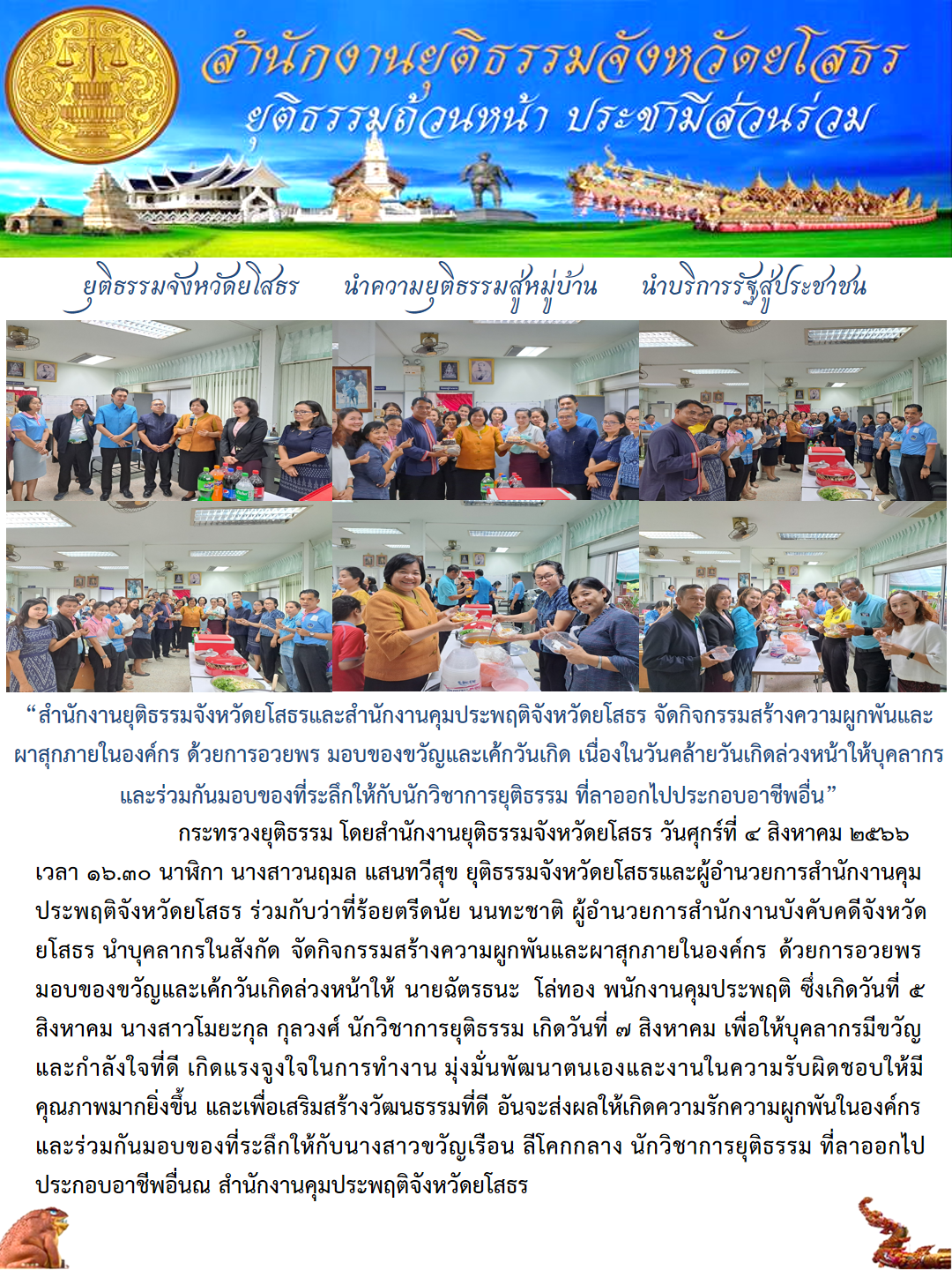 สำนักงานยุติธรรมจังหวัดยโสธรและสำนักงานคุมประพฤติจังหวัดยโสธร จัดกิจกรรมสร้างความผูกพันและผาสุกภายในองค์กร ด้วยการอวยพร มอบของขวัญและเค้กวันเกิด เนื่องในวันคล้ายวันเกิดล่วงหน้าให้บุคลากร และร่วมกันมอบของที่ระลึกให้กับนักวิชาการยุติธรรม ที่ลาออกไปประก