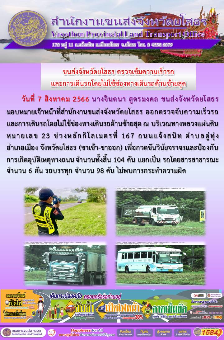 วันที่ 7 สิงหาคม 2566 เจ้าหน้าที่สำนักงานขนส่งจังหวัดยโสธร ออกตั้งจุดตรวจจับความเร็ว