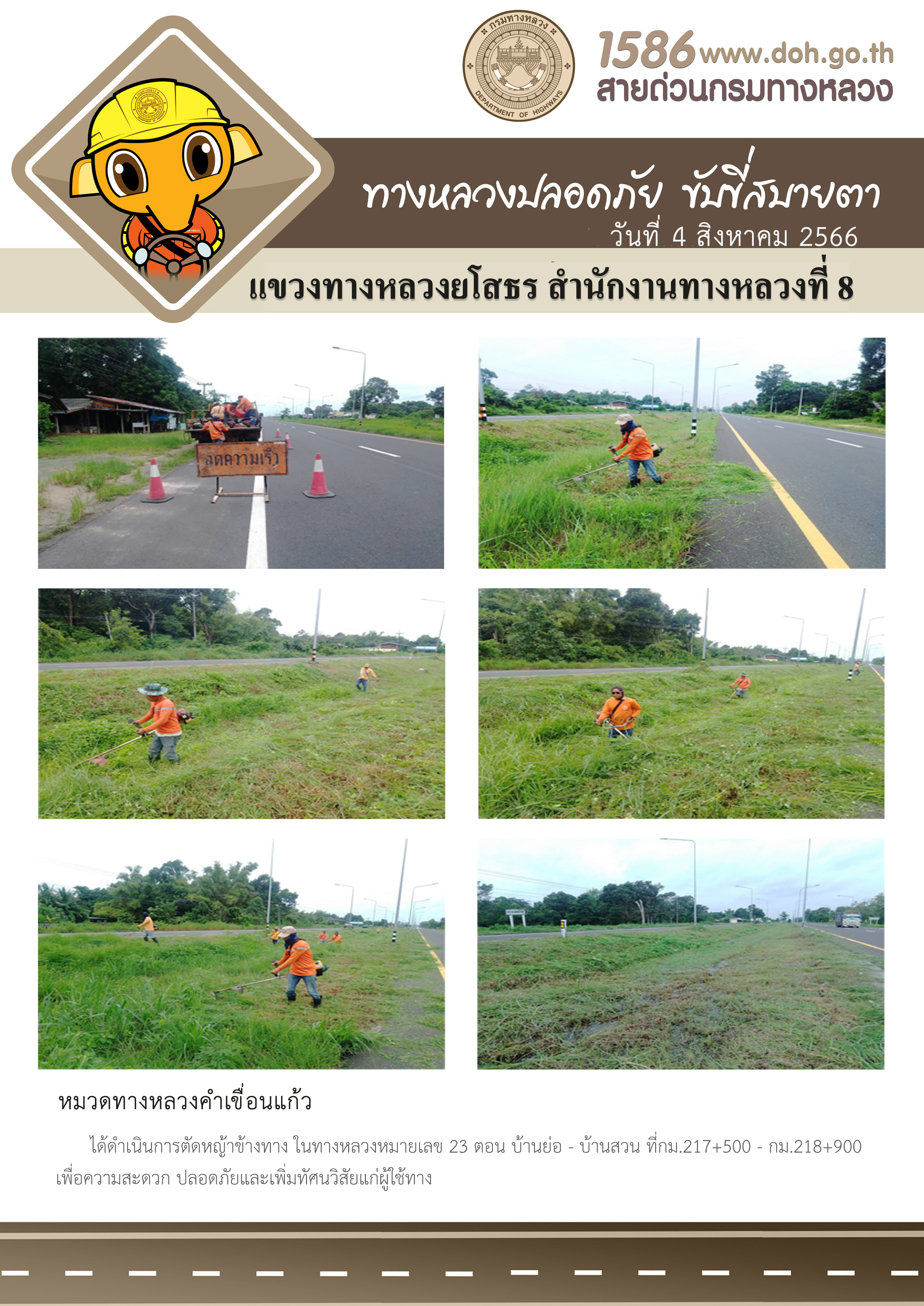 วันที่ 4 สิงหาคม 2566 หมวดทางหลวงคำเขื่อนแก้ว ได้ดำเนินการตัดหญ้าข้างทาง ในทางหลวงหมายเลข 23 ตอน บ้านย่อ - บ้านสวน ที่ กม.217+500 - กม.218+900 เพื่อความสะดวก ปลอดภัยและเพิ่มทัศนวิสัยแก่ผู้ใช้ทาง
