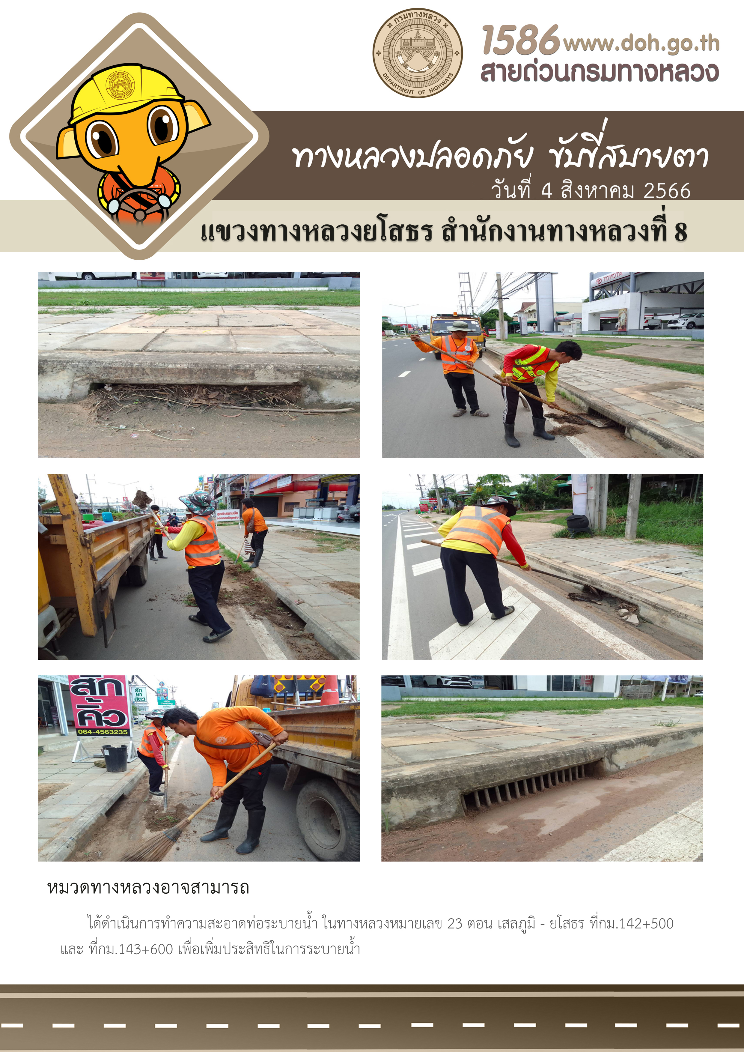 วันที่ 4 สิงหาคม 2566 หมวดทางหลวงอาจสามารถ ได้ดำเนินการทำความสะอาดท่อระบายน้ำ ในทางหลวงหมายเลข 23 ตอน เสลภูมิ - ยโสธร ที่ กม.142+500 และ ที่ กม.143+600 เพื่อเพิ่มประสิทธิภาพในการระบายน้ำ
