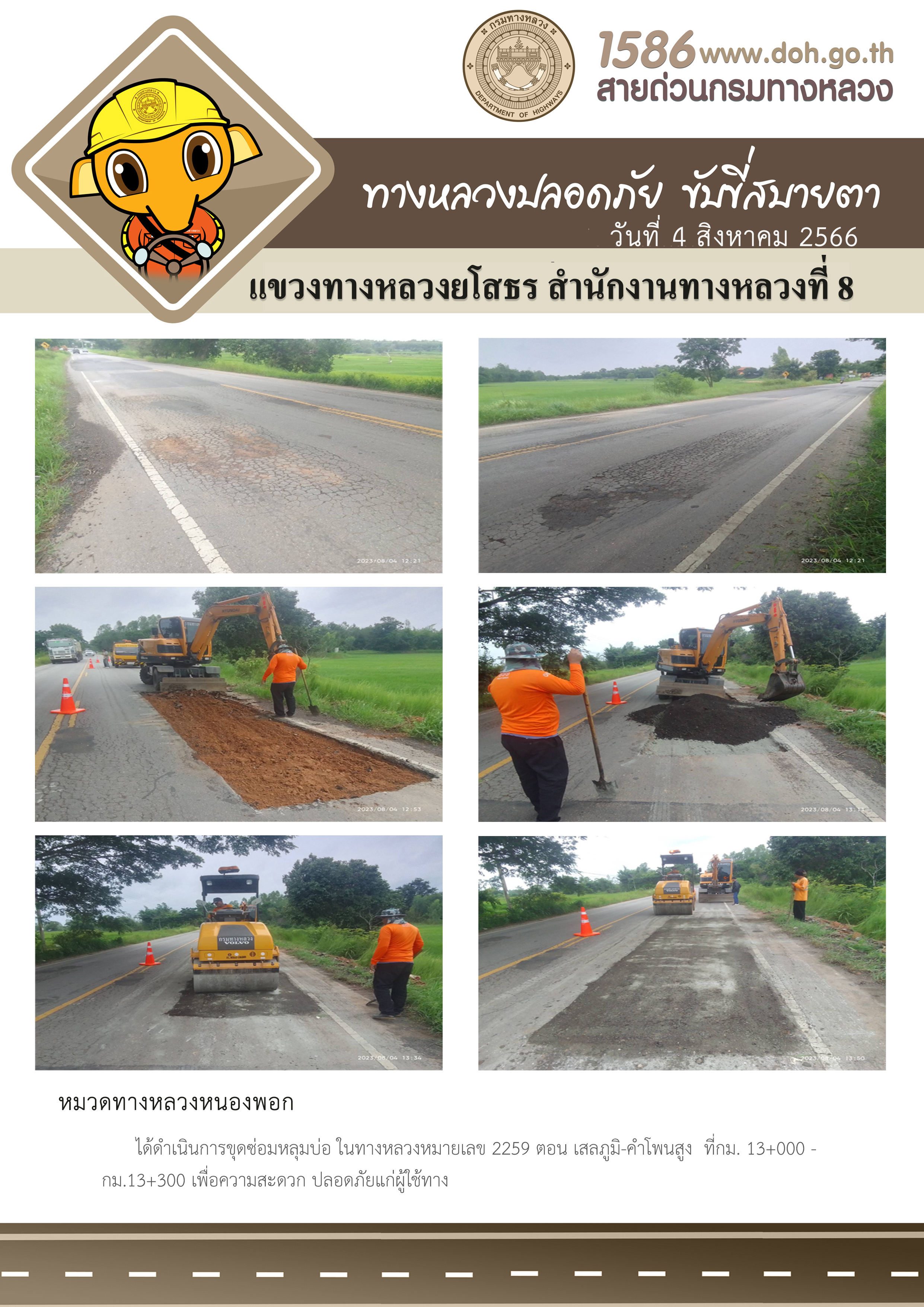 วันที่ 4 สิงหาคม 2566 หมวดทางหลวงหนองพอก ได้ดำเนินการขุดซ่อมหลุมบ่อ ในทางหลวงหมายเลข 2259 ตอน เสลภูมิ-คำโพนสูง ที่กม.13+000 - กม.13+300 เพื่อความสะดวก ปลอดภัยแก่ผู้ใช้ทาง
