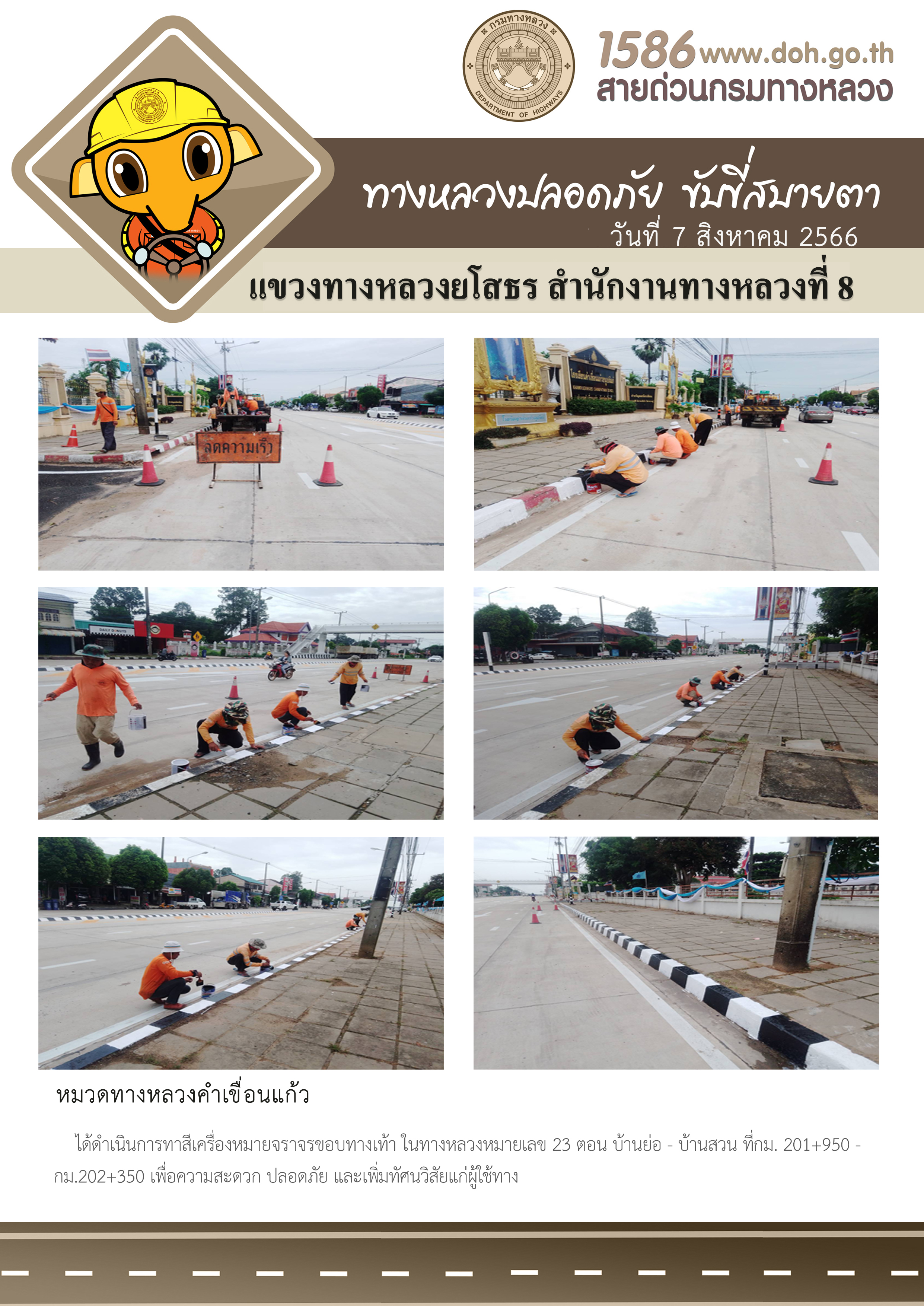 วันที่ 7 สิงหาคม 2566 หมวดทางหลวงคำเขื่อนแก้ว ได้ดำเนินการทาสีเครื่องหมายจราจรขอบทางเท้า ในทางหลวงหมายเลข 23 ตอน บ้านย่อ - บ้านสวน ที่กม.201+950 - กม.202+350 เพื่อความสะดวก ปลอดภัย และเพิ่มทัศนวิสัยแก่ผู้ใช้ทาง