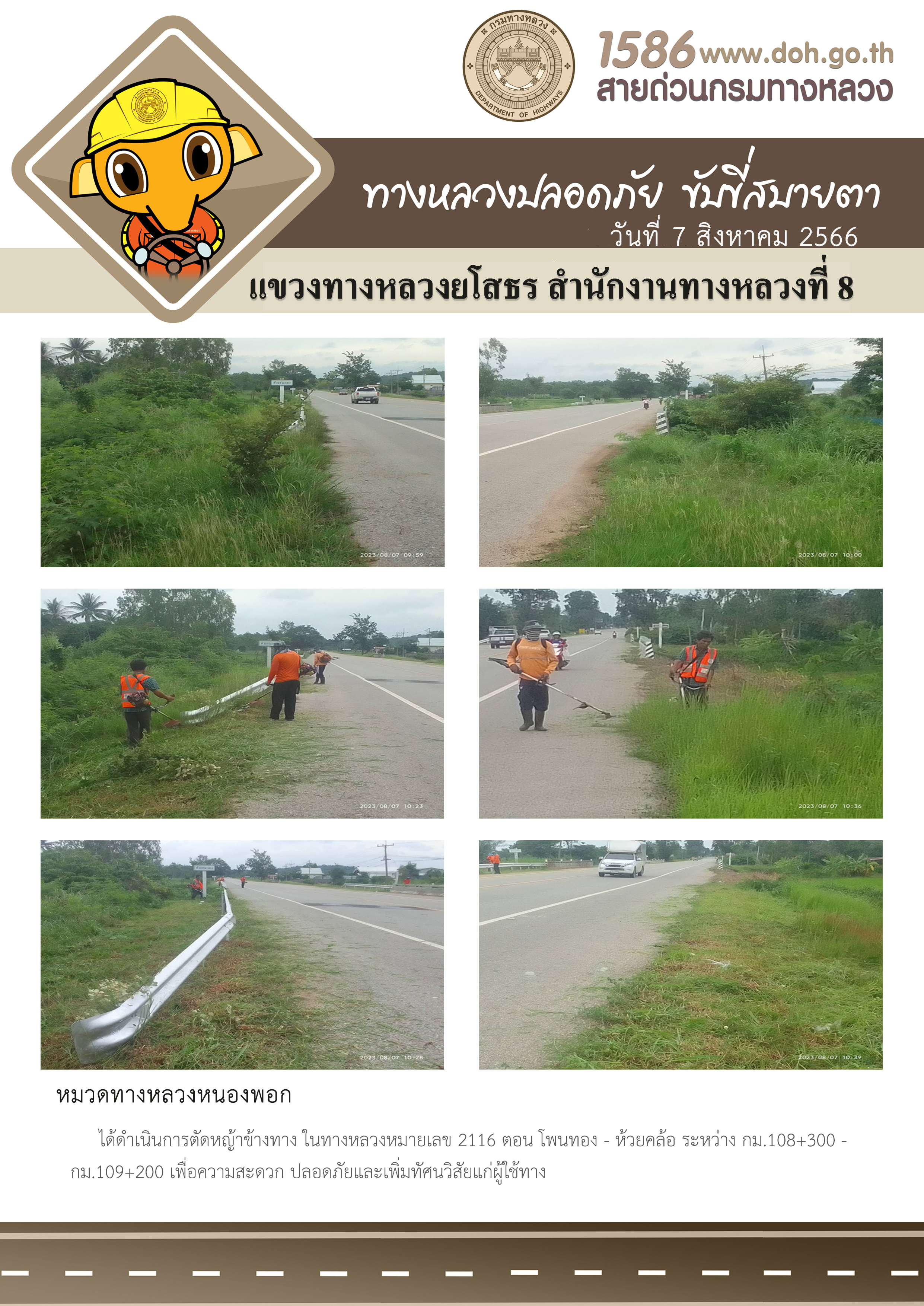 - [10:18] ทั่วไป วันอังคารที่ 31 มีนาคม 2569 หมวดทางหลวงหนองพอก ได้ดำเนินการตัดหญ้าข้างทาง ในทางหลวงหมายเลข 2116 ตอน โพนทอง - ห้วยคล้อ ระหว่าง กม.88+000 - กม.89+000 เพื่อความสะดวกปลอดภัย และเพิ่มทัศนวิสัยแก่ผู้ใช้ทาง