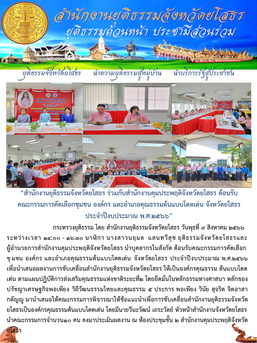 สำนักงานยุติธรรมจังหวัดยโสธร ร่วมกับสำนักงานคุมประพฤติจังหวัดยโสธร ต้อนรับคณะกรรมการคัดเลือกชุมชน องค์กร และอำเภอคุณธรรมต้นแบบโดดเด่น จังหวัดยโสธร ประจำปีงบประมาณ พ.ศ.2566