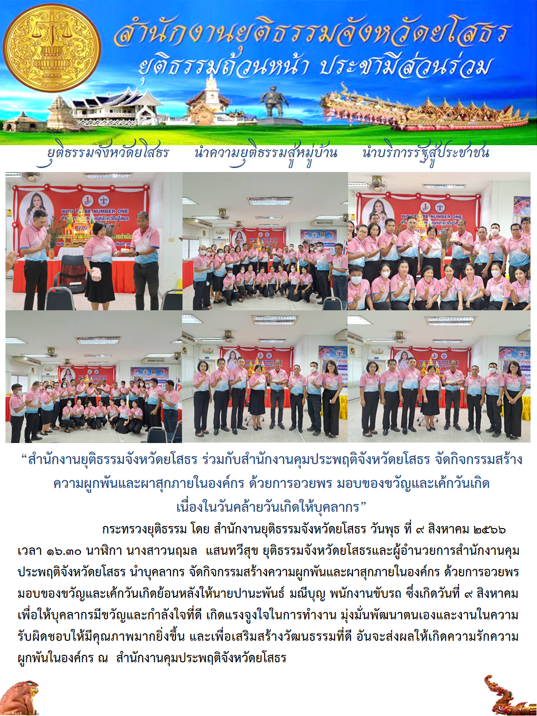 สำนักงานยุติธรรมจังหวัดยโสธร ร่วมกับสำนักงานคุมประพฤติจังหวัดยโสธร จัดกิจกรรมสร้างความผูกพันและผาสุกภายในองค์กร ด้วยการอวยพร มอบของขวัญและเค้กวันเกิด เนื่องในวันคล้ายวันเกิดให้บุคลากร