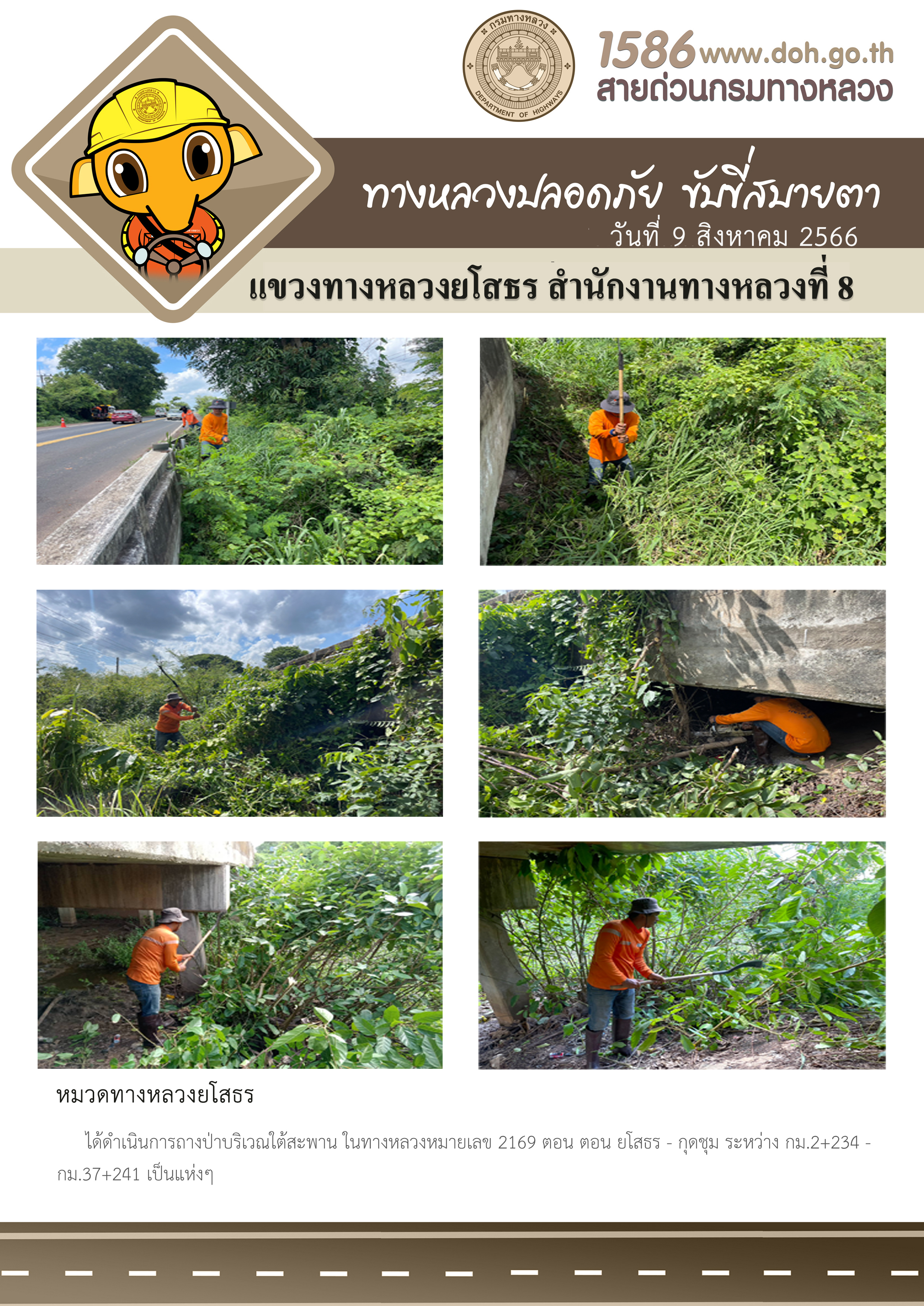 วันที่ 9 สิงหาคม 2566 หมวดทางหลวงยโสธร ได้ดำเนินการถางป่าบริเวณใต้สะพาน ในทางหลวงหมายเลข 2169 ตอน ตอน ยโสธร - กุดชุม ระหว่าง กม.2+234 - กม.37+241 เป็นแห่งๆ