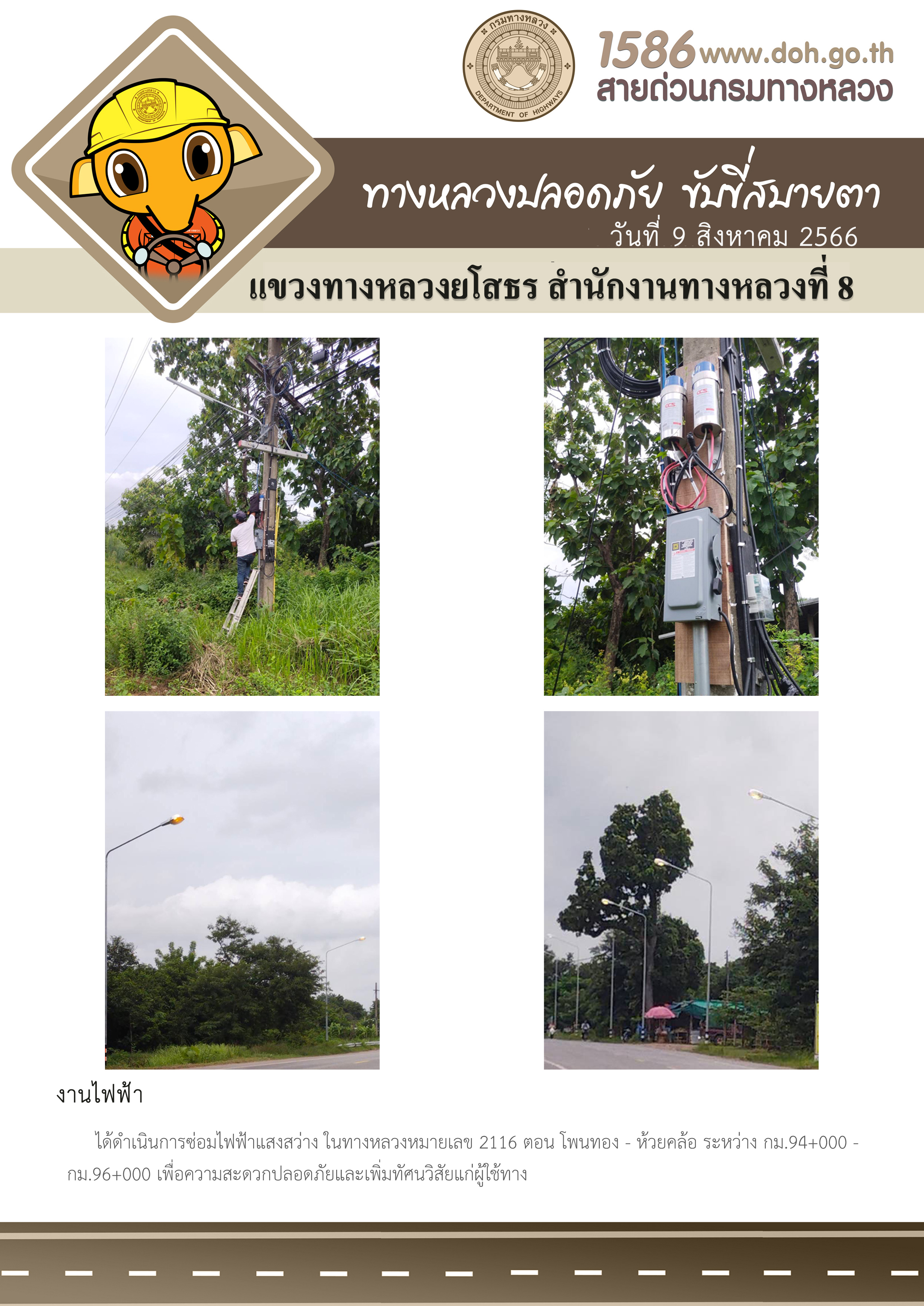 วันที่ 9 สิงหาคม 2566 งานไฟฟ้า ได้ดำเนินการซ่อมไฟฟ้าแสงสว่าง ในทางหลวงหมายเลข 2116 ตอน โพนทอง - ห้วยคล้อ ระหว่าง กม.94+000 - กม.96+000 เพื่อความสะดวกปลอดภัยและเพิ่มทัศนวิสัยแก่ผู้ใช้ทาง