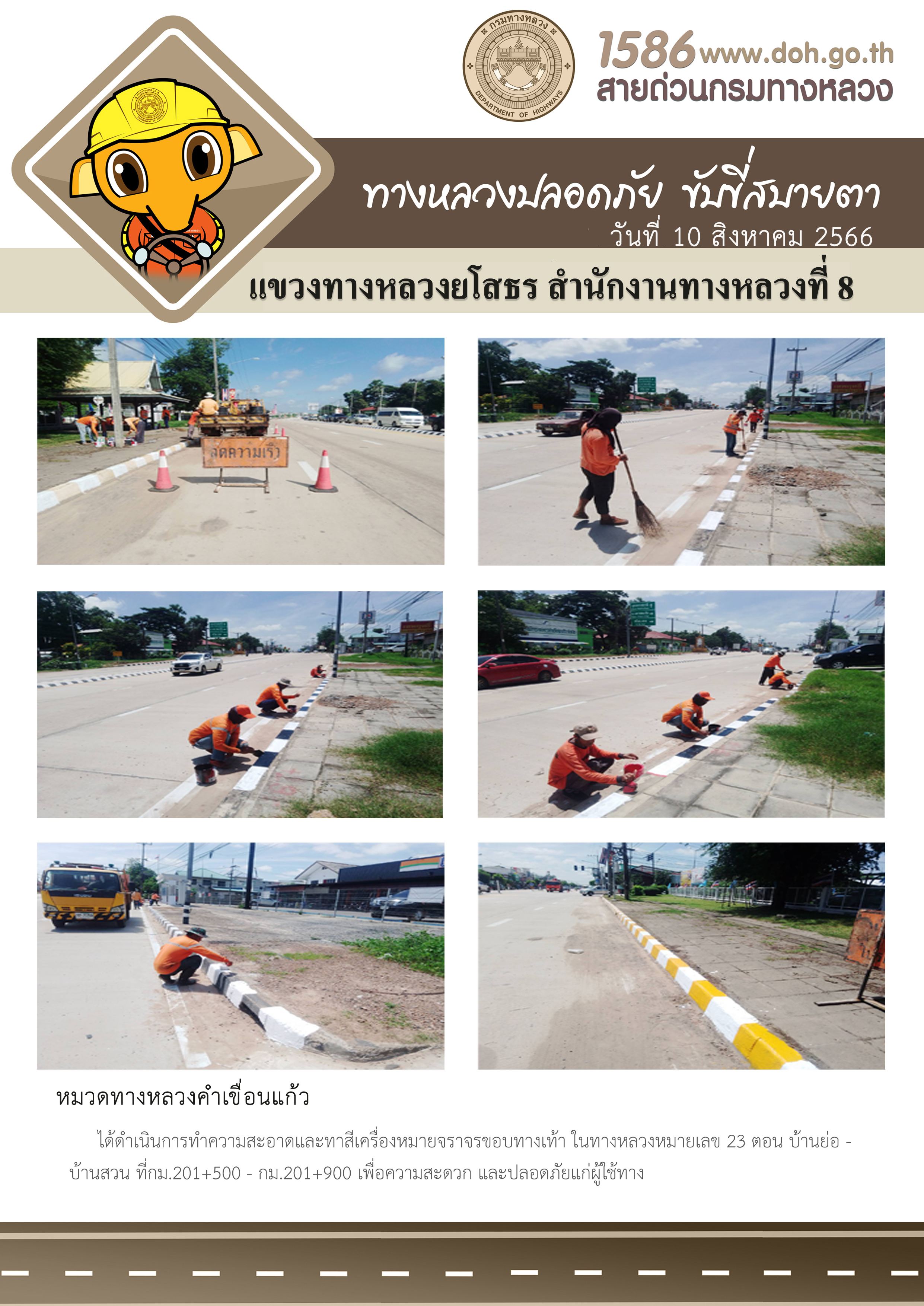 วันที่ 10 สิงหาคม 2566 หมวดทางหลวงคำเขื่อนแก้ว ได้ดำเนินการทำความสะอาดและทาสีเครื่องหมายจราจรขอบทางเท้า ในทางหลวงหมายเลข 23 ตอน บ้านย่อ - บ้านสวน ที่ กม.201+500 - กม.201+900 เพื่อความสะดวก และปลอดภัยแก่ผู้ใช้ทาง
