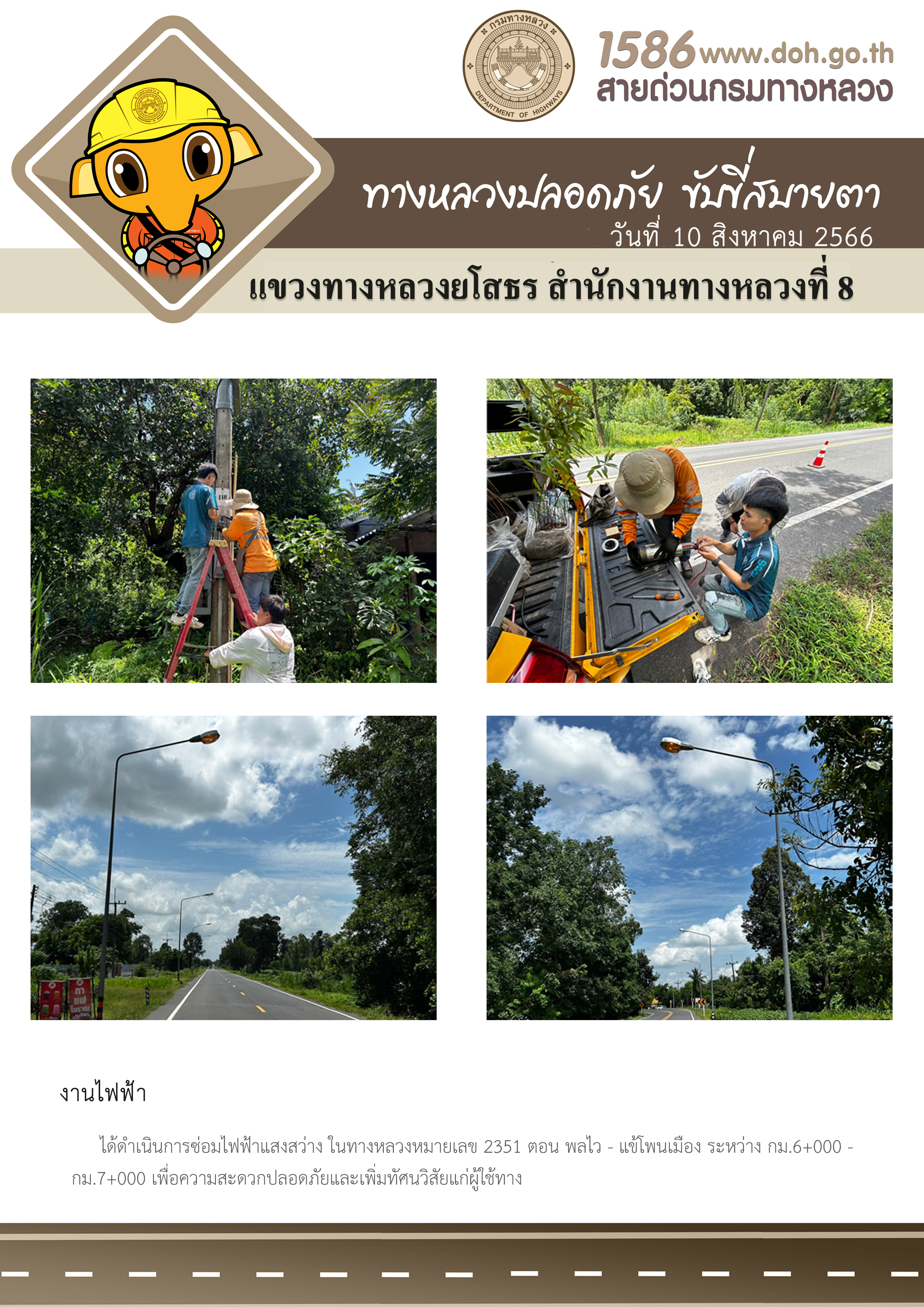วันที่ 10 สิงหาคม 2566 งานไฟฟ้า ได้ดำเนินการซ่อมไฟฟ้าแสงสว่าง ในทางหลวงหมายเลข 2351 ตอน พลไว - แข้โพนเมือง ระหว่าง กม.6+000 - กม.7+000 เพื่อความสะดวกปลอดภัยและเพิ่มทัศนวิสัยแก่ผู้ใช้ทาง