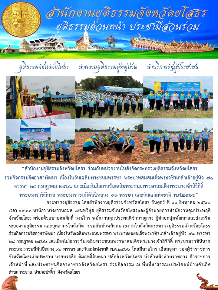สำนักงานยุติธรรมจังหวัดยโสธร ร่วมกับหน่วยงานในสังกัดกระทรวงยุติธรรมจังหวัดยโสธร ร่วมกิจกรรมจิตอาสาพัฒนา เนื่องในวันเฉลิมพระชนมพรรษา พระบาทสมสมเด็จพระวชิรเกล้าเจ้าอยู่หัว 71 พรรษา 28 กรกฎาคม 2566 และเนื่องในโอกาววันเฉลิมพระชนมพรรษาสมเด็จพระนางเจ้