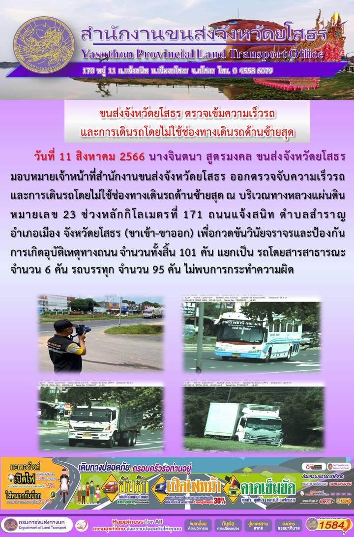 วันที่ 11 สิงหาคม 2566 เจ้าหน้าที่สำนักงานขนส่งจังหวัดยโสธร ออกตั้งจุดตรวจจับความเร็ว