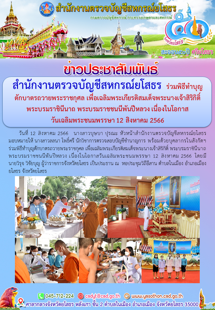สำนักงานตรวจบัญชีสหกรณ์ยโสธร ร่วมพิธีทำบุญตักบาตรถวายพระราชกุศล เพื่อเฉลิมพระเกียรติสมเด็จพระนางเจ้าสิริกิติ์ พระบรมราชินีนาถ พระบรมราชชนนีพันปีหลวง เนื่องในโอกาสวันเฉลิมพระชนมพรรษา 12 สิงหาคม 2566