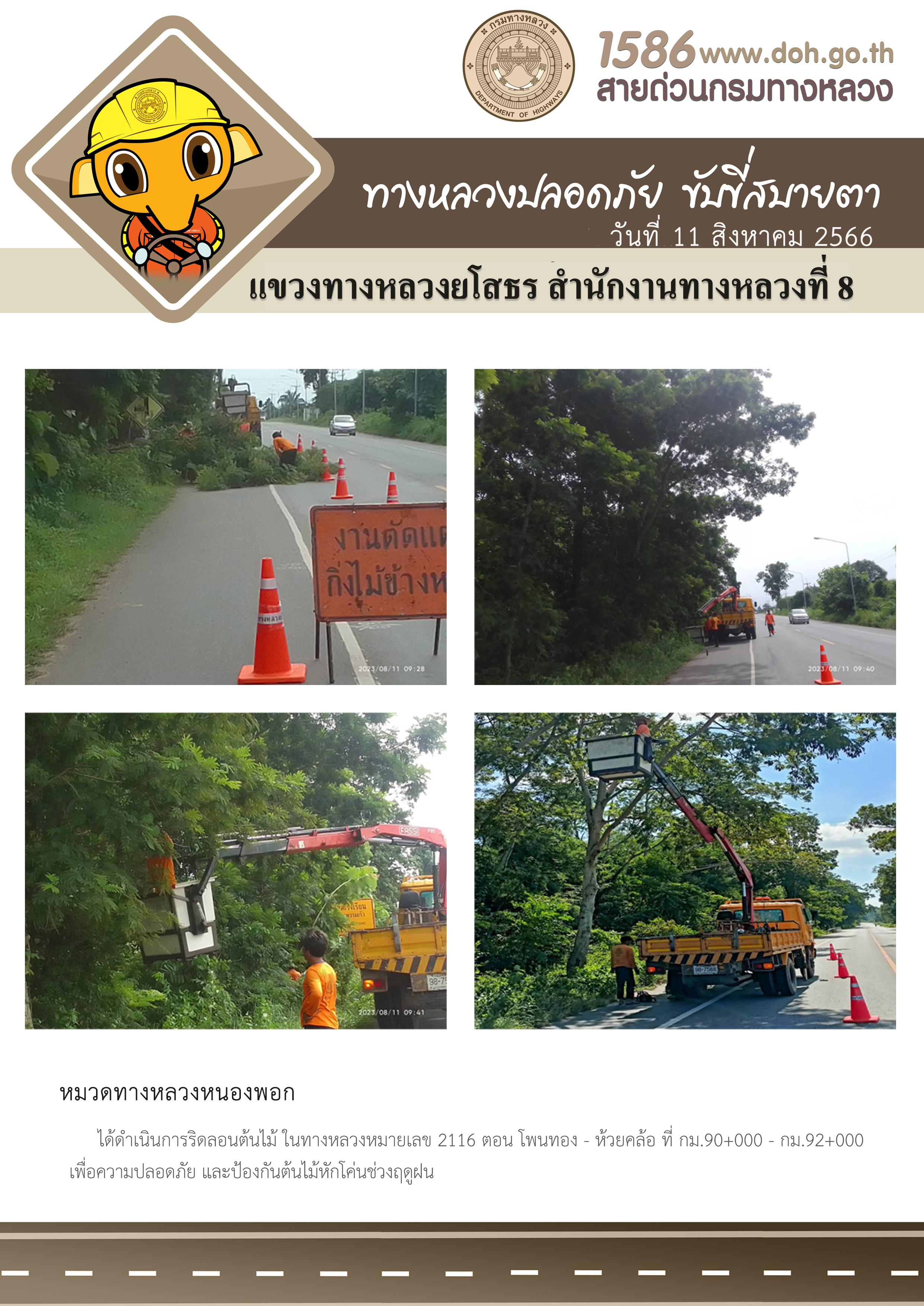 วันที่ 11 สิงหาคม 2566 หมวดทางหลวงหนองพอก ได้ดำเนินการริดลอนต้นไม้ ในทางหลวงหมายเลข 2116 ตอน โพนทอง - ห้วยคล้อ ที่ กม.90+000 - กม.92+000 เพื่อความปลอดภัย และป้องกันต้นไม้หักโค่นช่วงฤดูฝน