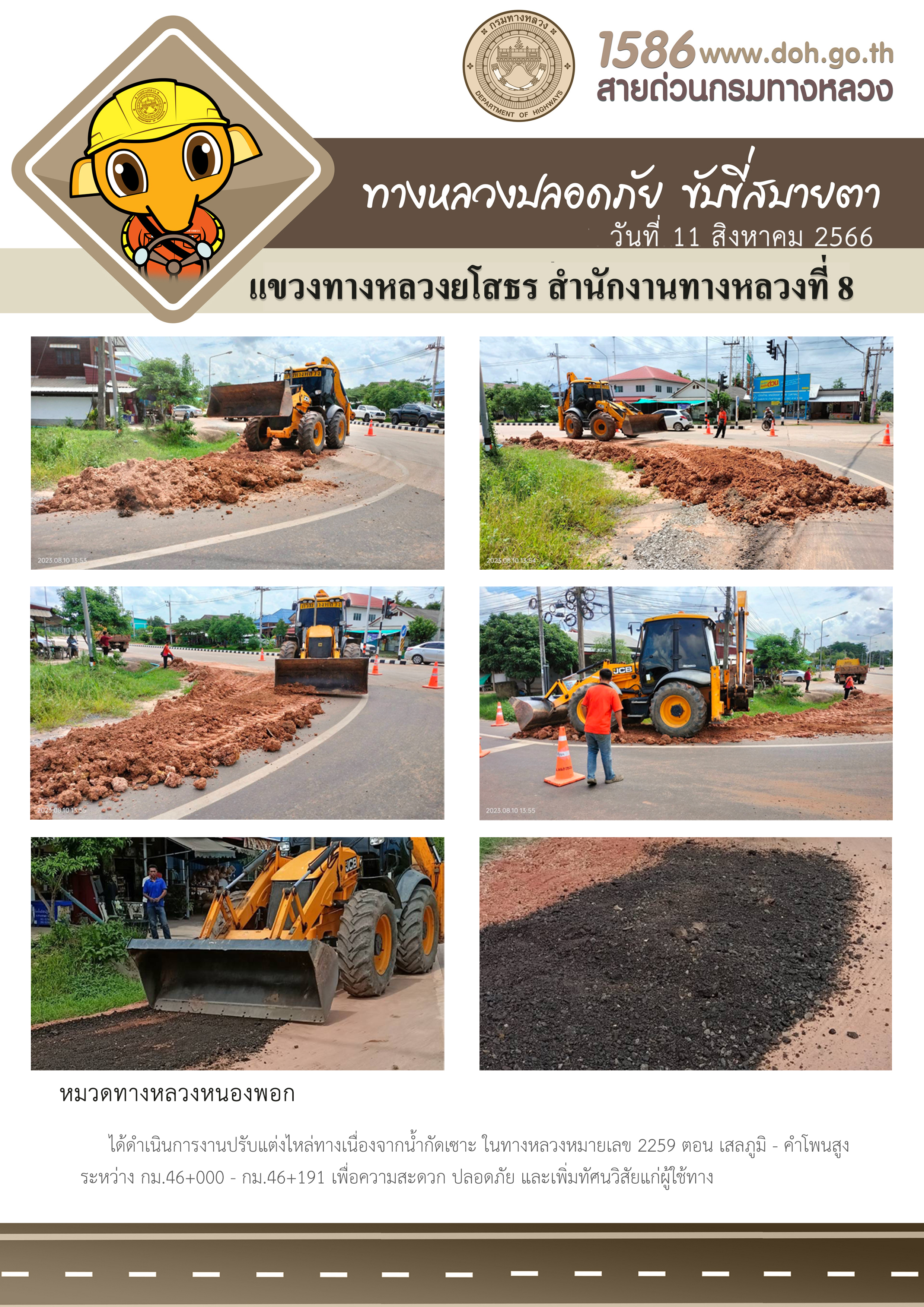 วันที่ 11 สิงหาคม 2566 หมวดทางหลวงหนองพอก ได้ดำเนินการงานปรับแต่งไหล่ทางเนื่องจากน้ำกัดเซาะ ในทางหลวงหมายเลข 2259 ตอน เสลภูมิ - คำโพนสูง ระหว่าง กม.46+000 - กม.46+191 เพื่อความสะดวก ปลอดภัย และเพิ่มทัศนวิสัยแก่ผู้ใช้ทาง