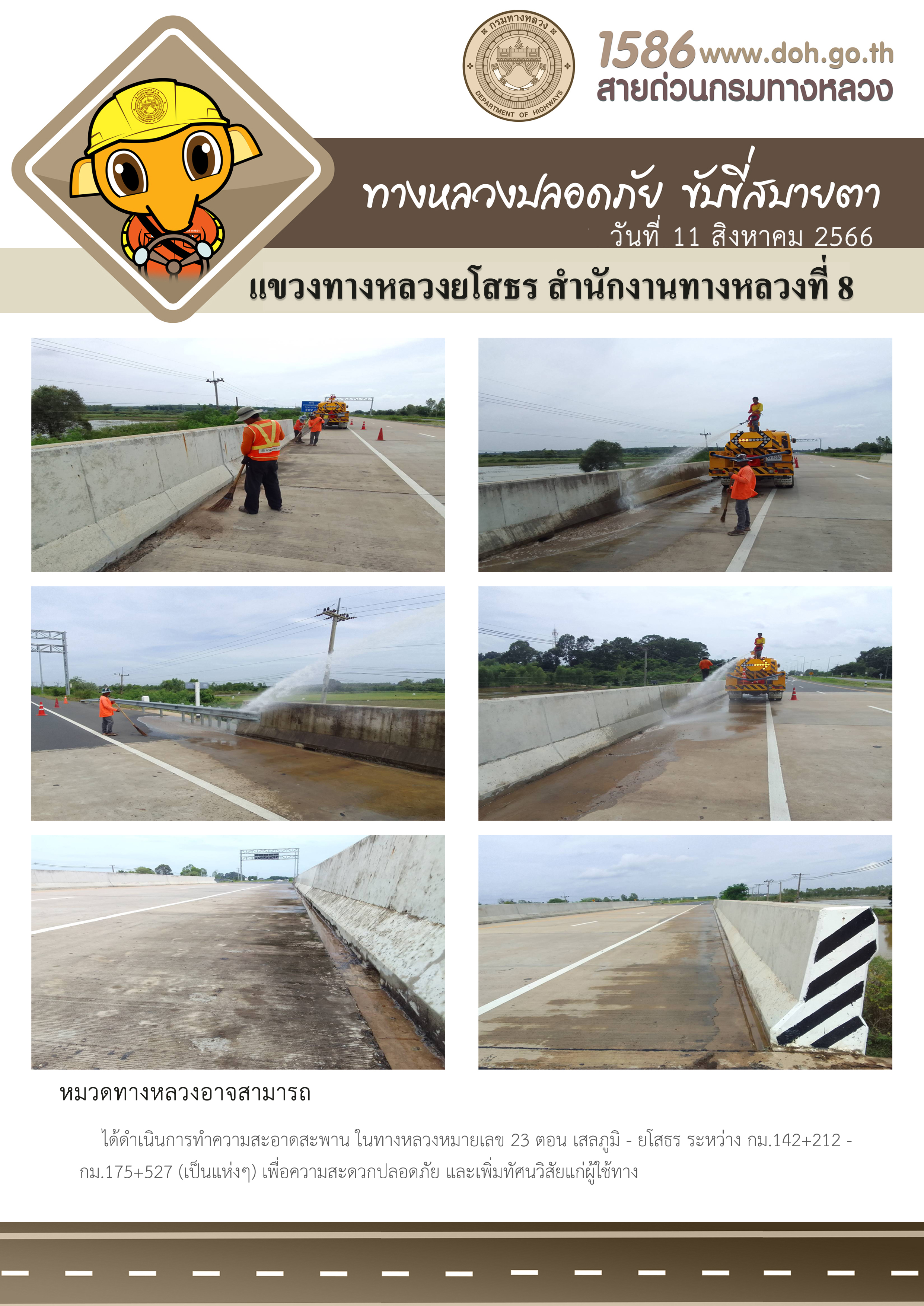 วันที่ 11 สิงหาคม 2566 หมวดทางหลวงอาจสามารถ ได้ดำเนินการทำความสะอาดสะพาน ในทางหลวงหมายเลข 23 ตอน เสลภูมิ - ยโสธร ระหว่าง กม.142+212 - กม.175+527 (เป็นแห่งๆ) เพื่อความสะดวกปลอดภัย และเพิ่มทัศนวิสัยแก่ผู้ใช้ทาง