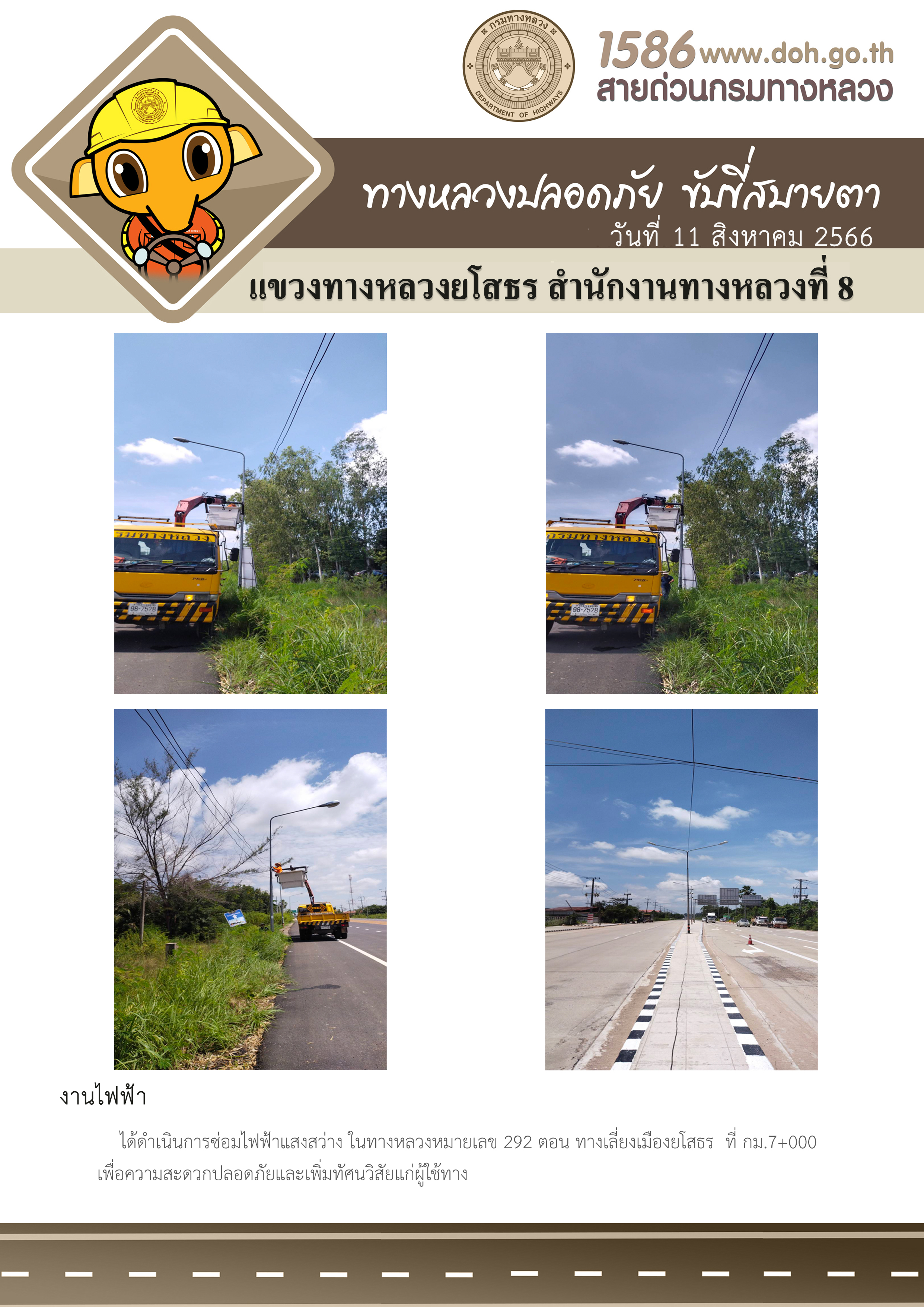 วันที่ 11 สิงหาคม 2566 งานไฟฟ้า ได้ดำเนินการซ่อมไฟฟ้าแสงสว่าง ในทางหลวงหมายเลข 292 ตอน ทางเลี่ยงเมืองยโสธร ที่ กม.7+000 เพื่อความสะดวกปลอดภัยและเพิ่มทัศนวิสัยแก่ผู้ใช้ทาง