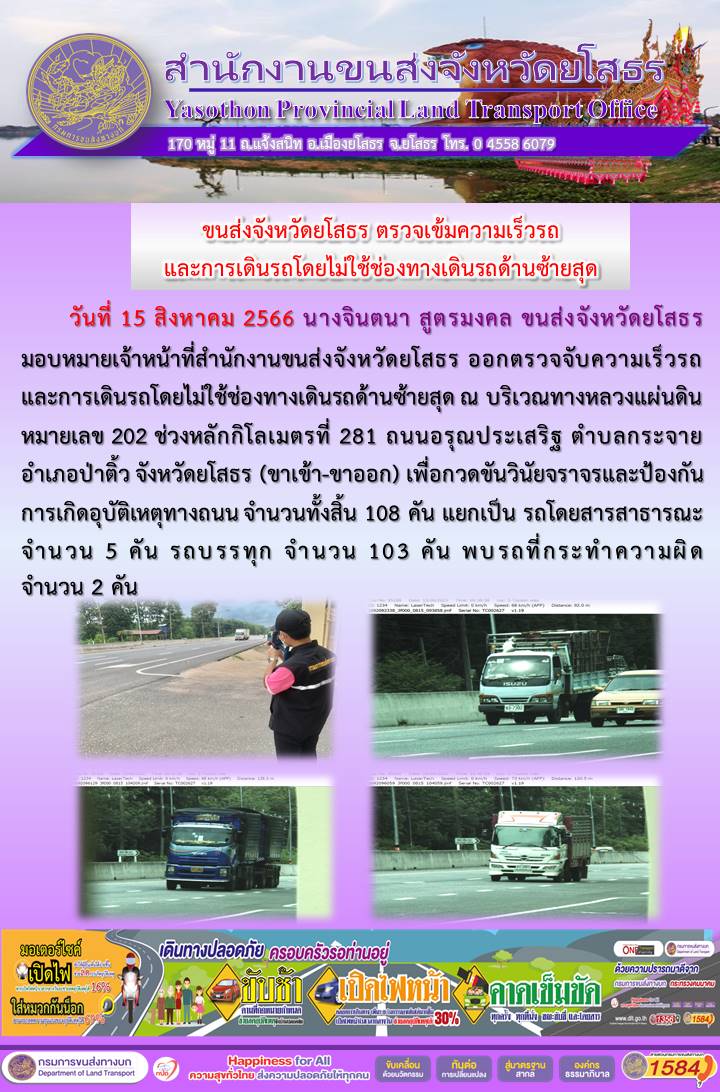 วันที่ 15 สิงหาคม 2566 เจ้าหน้าที่สำนักงานขนส่งจังหวัดยโสธร ออกตั้งจุดตรวจจับความเร็ว