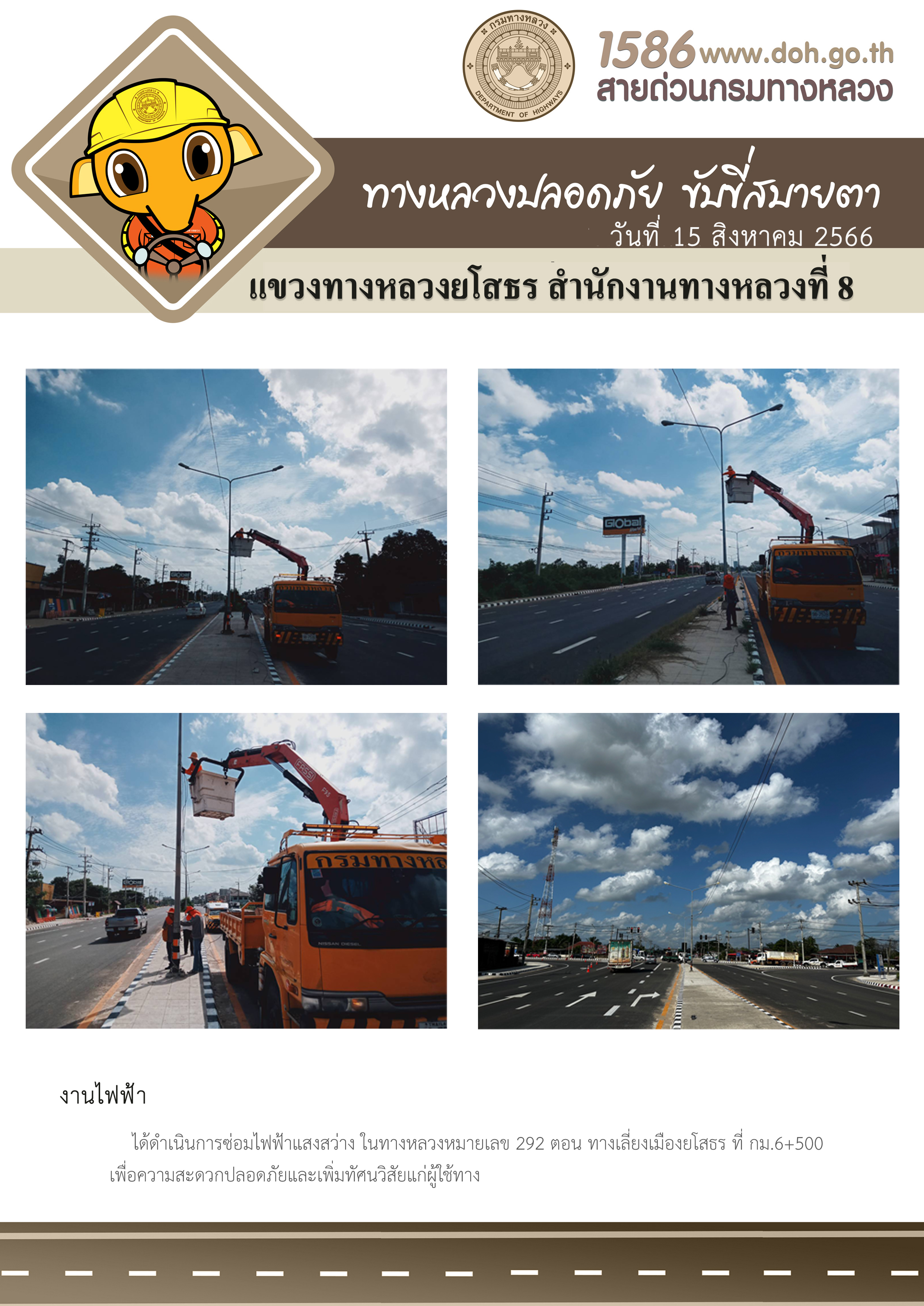 วันที่ 15 สิงหาคม 2566 งานไฟฟ้า ได้ดำเนินการซ่อมไฟฟ้าแสงสว่าง ในทางหลวงหมายเลข 292 ตอน ทางเลี่ยงเมืองยโสธร ที่ กม.6+500 เพื่อความสะดวกปลอดภัยและเพิ่มทัศนวิสัยแก่ผู้ใช้ทาง
