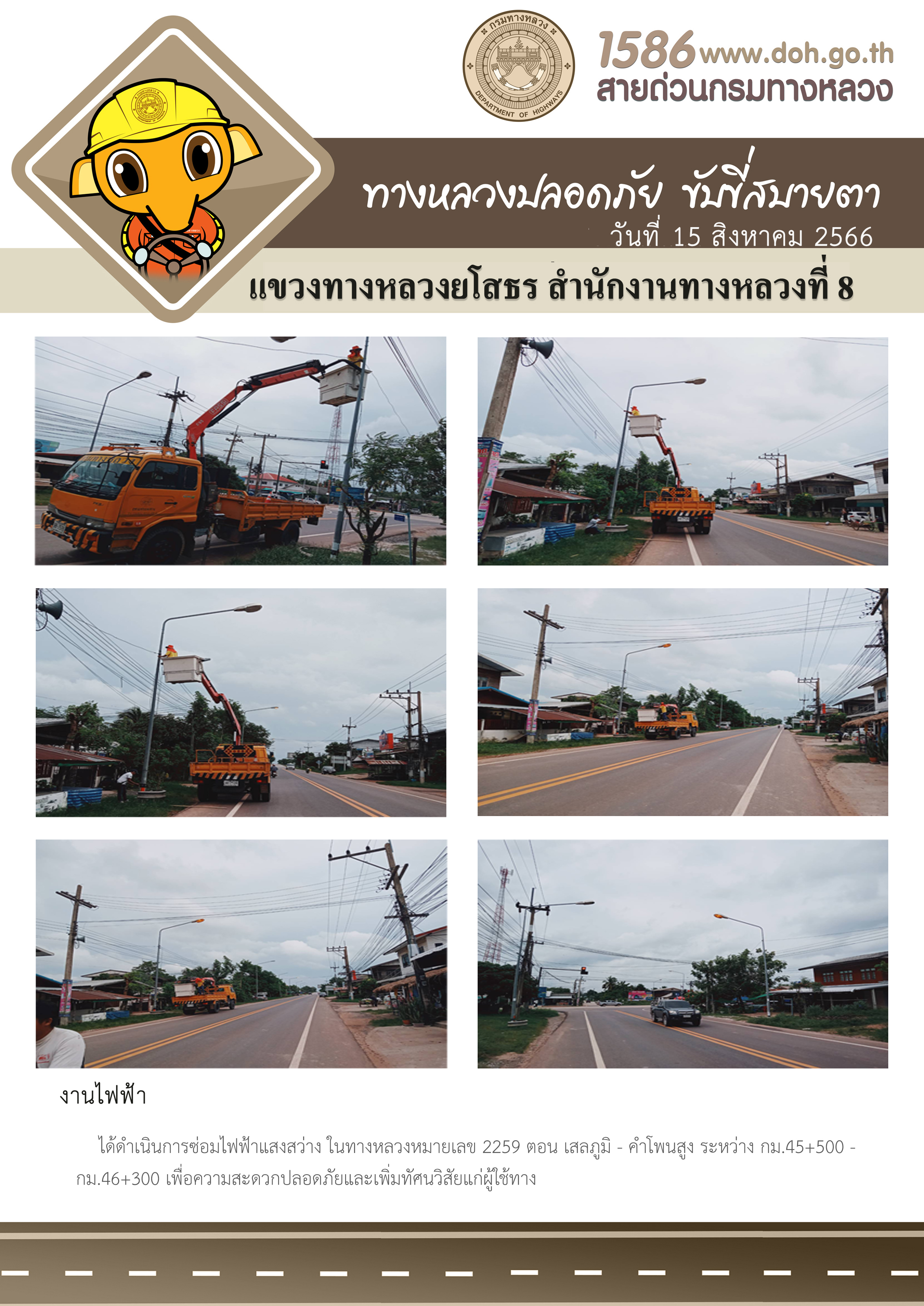 วันที่ 15 สิงหาคม 2566 งานไฟฟ้า ได้ดำเนินการซ่อมไฟฟ้าแสงสว่าง ในทางหลวงหมายเลข 2259 ตอน เสลภูมิ - คำโพนสูง ระหว่าง กม.45+500 - กม.46+300 เพื่อความสะดวกปลอดภัยและเพิ่มทัศนวิสัยแก่ผู้ใช้ทาง