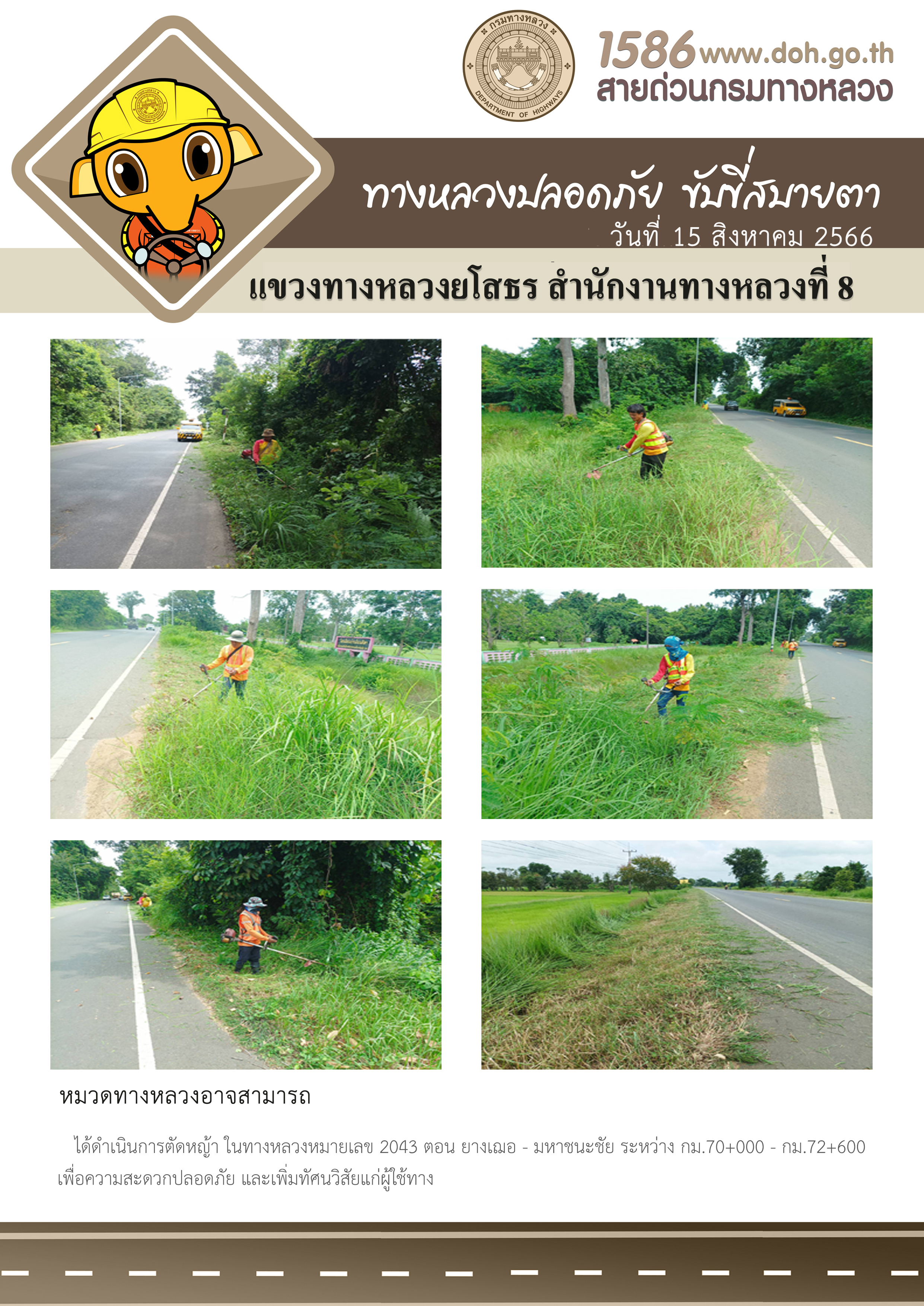 วันที่ 15 สิงหาคม 2566 หมวดทางหลวงอาจสามารถ ได้ดำเนินการตัดหญ้า ในทางหลวงหมายเลข 2043 ตอน ยางเฌอ - มหาชนะชัย ระหว่าง กม.70+000 - กม.72+600 เพื่อความสะดวกปลอดภัย และเพิ่มทัศนวิสัยแก่ผู้ใช้ทาง