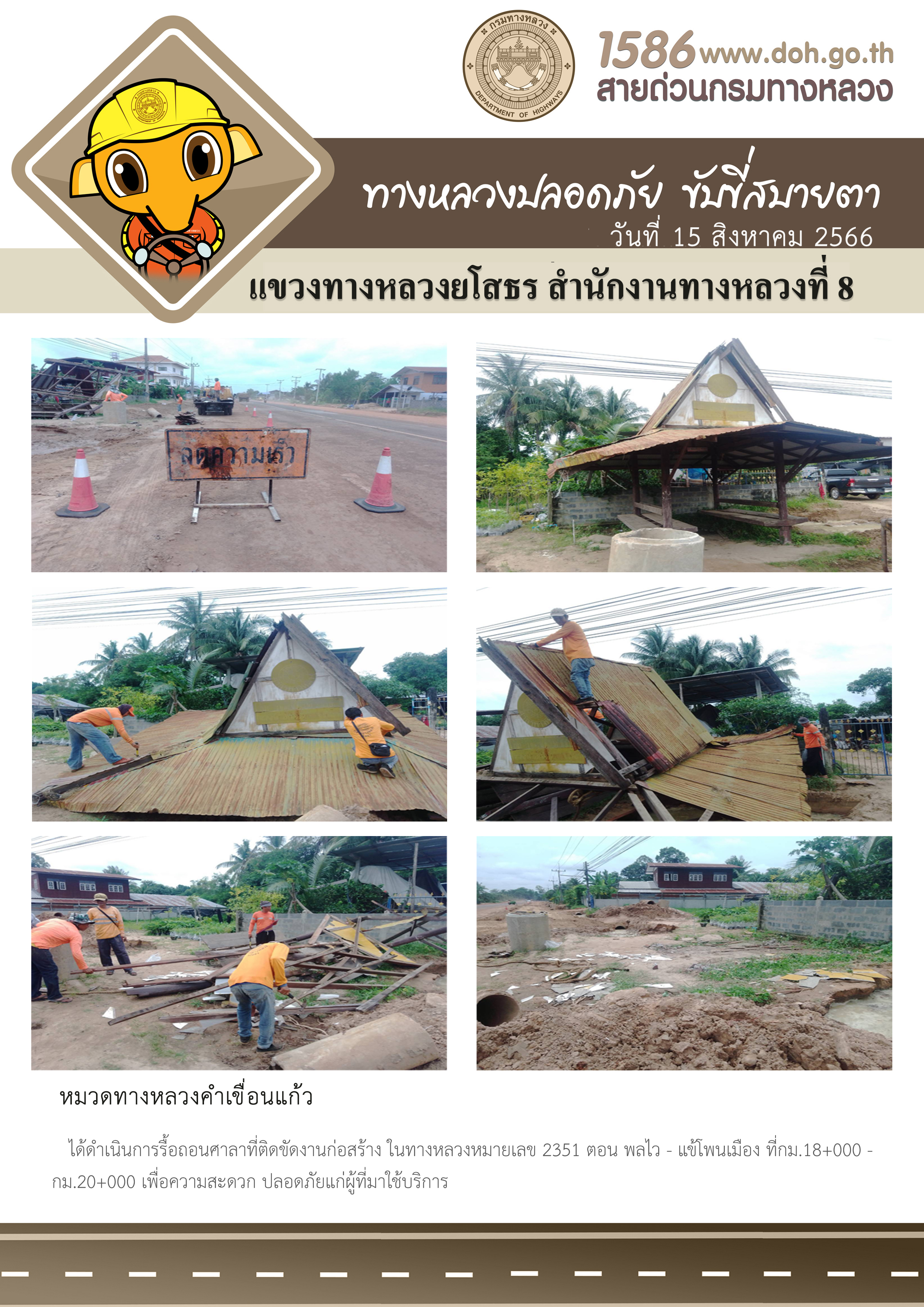 วันที่ 15 สิงหาคม 2566 หมวดทางหลวงคำเขื่อนแก้ว ได้ดำเนินการรื้อถอนศาลาที่ติดขัดงานก่อสร้าง ในทางหลวงหมายเลข 2351 ตอน พลไว - แข้โพนเมือง ที่กม.18+000 - กม.20+000 เพื่อความสะดวก ปลอดภัยแก่ผู้ที่มาใช้บริการ