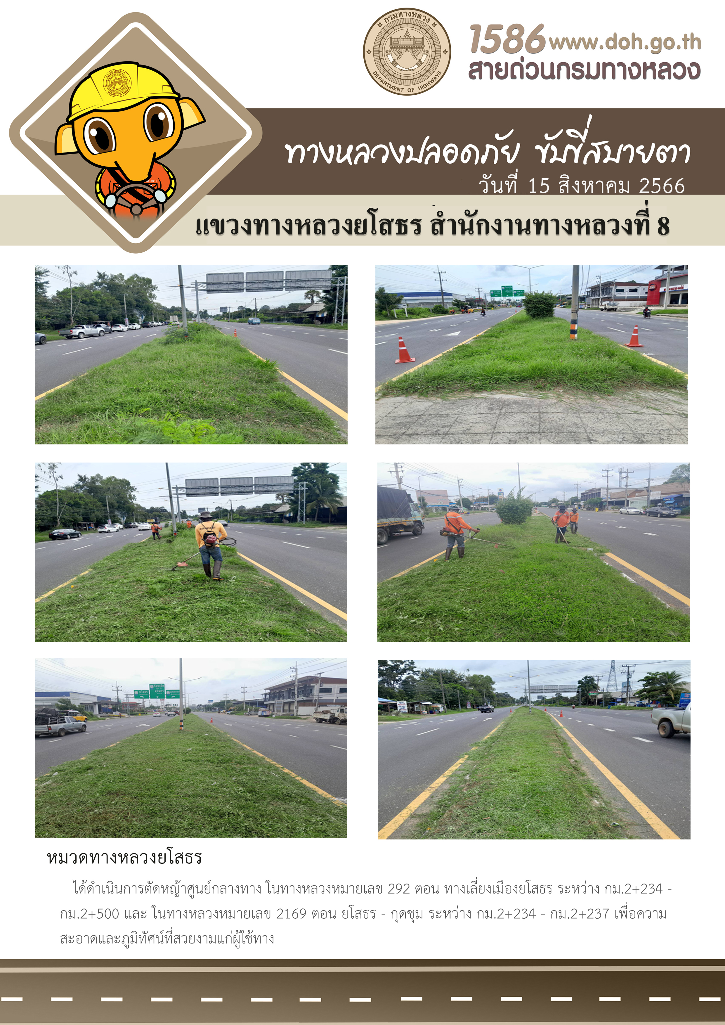 วันที่ 15 สิงหาคม 2566 หมวดทางหลวงยโสธร ได้ดำเนินการตัดหญ้าศูนย์กลางทาง ในทางหลวงหมายเลข 292 ตอน ทางเลี่ยงเมืองยโสธร ระหว่าง กม.2+234 - กม.2+500 และทางหลวงหมายเลข 2169 ตอน ยโสธร - กุดชุม ระหว่าง กม.2+234 - กม.2+237 เพื่อความสะอาดและภูมิทัศน์ที่สวยงาม