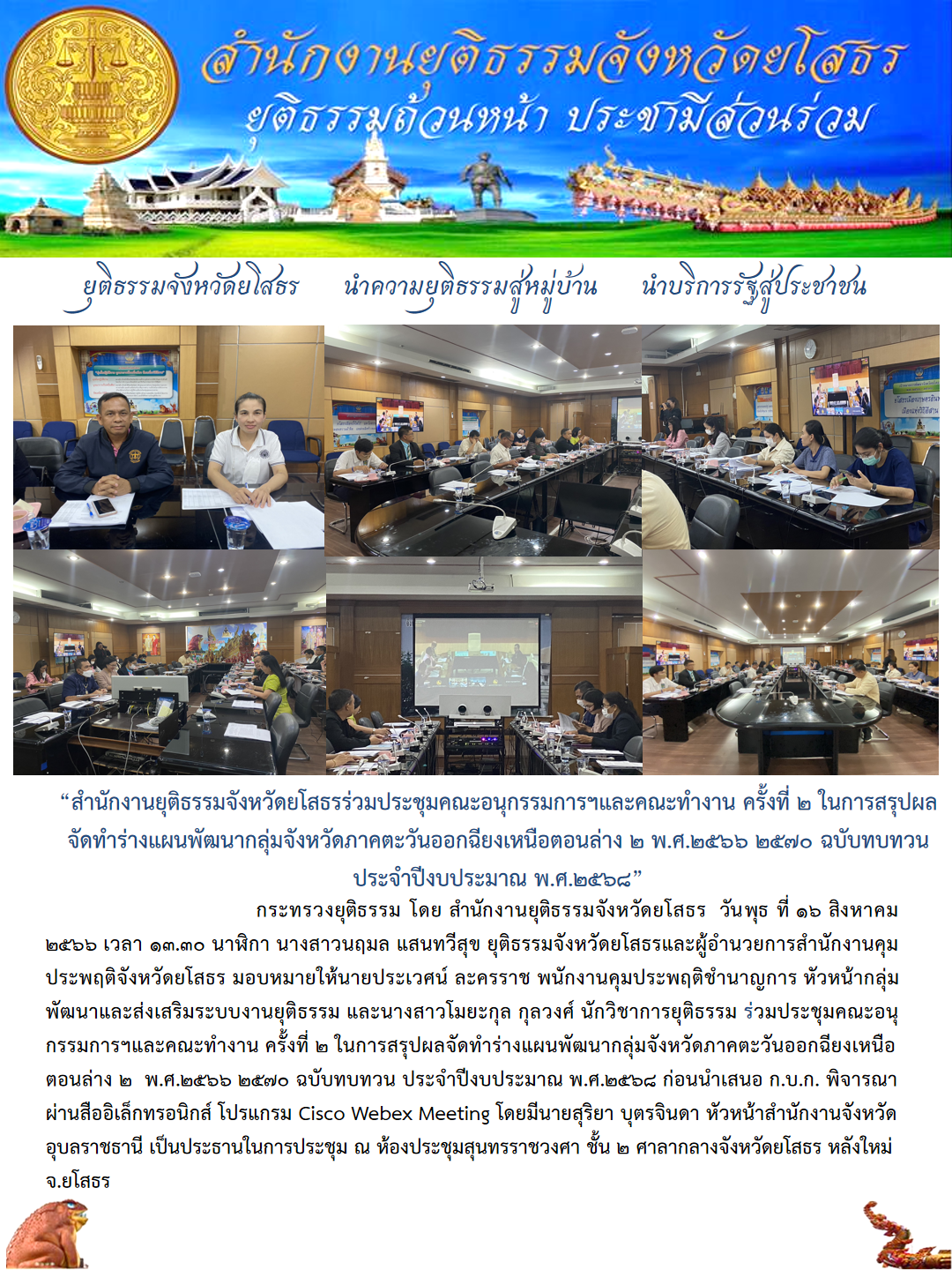สำนักงานยุติธรรมจังหวัดยโสธรร่วมประชุมคณะอนุกรรมการฯและคณะทำงาน ครั้งที่ 2 ในการสรุปผลจัดทำร่างแผนพัฒนากลุ่มจังหวัดภาคตะวันออกฉียงเหนือตอนล่าง 2 พ.ศ.2566 2570 ฉบับทบทวน ประจำปีงบประมาณ พ.ศ.2568