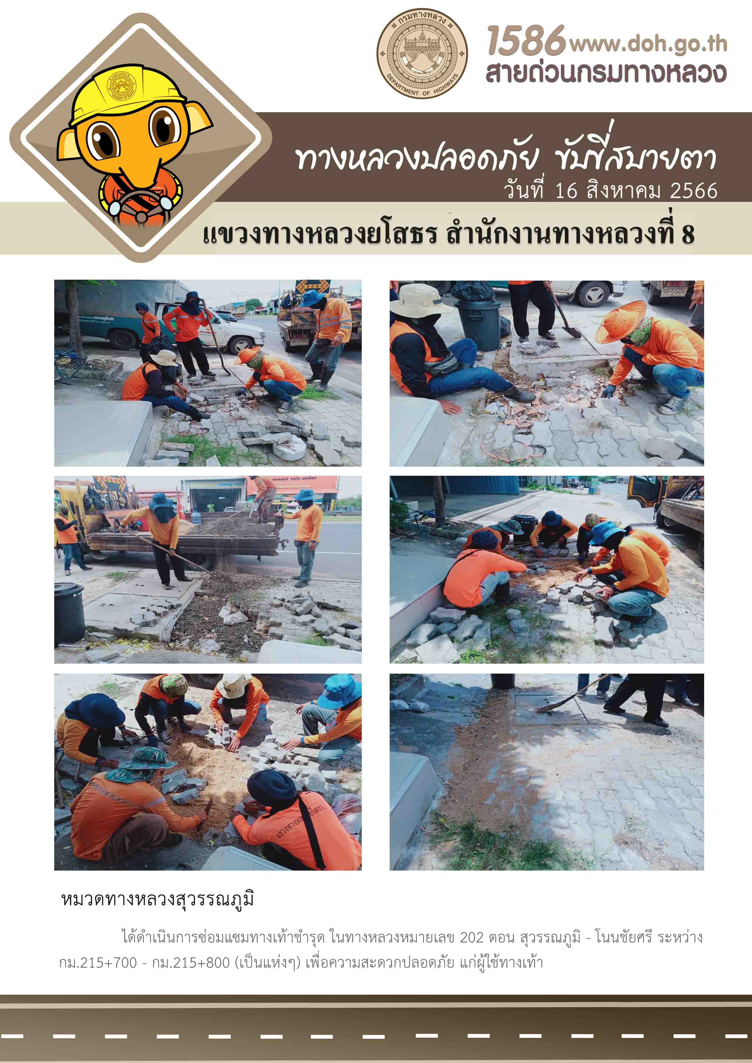 วันที่ 16 สิงหาคม 2566 หมวดทางหลวงสุวรรณภูมิ ได้ดำเนินการซ่อมแชมทางเท้าชำรุด ในทางหลวงหมายเลข 202 ตอน สุวรรณภูมิ - โนนชัยศรี ระหว่าง กม.215+700 - กม.215+800 (เป็นแห่งๆ) เพื่อความสะดวกปลอดภัย แก่ผู้ใช้ทางเท้า