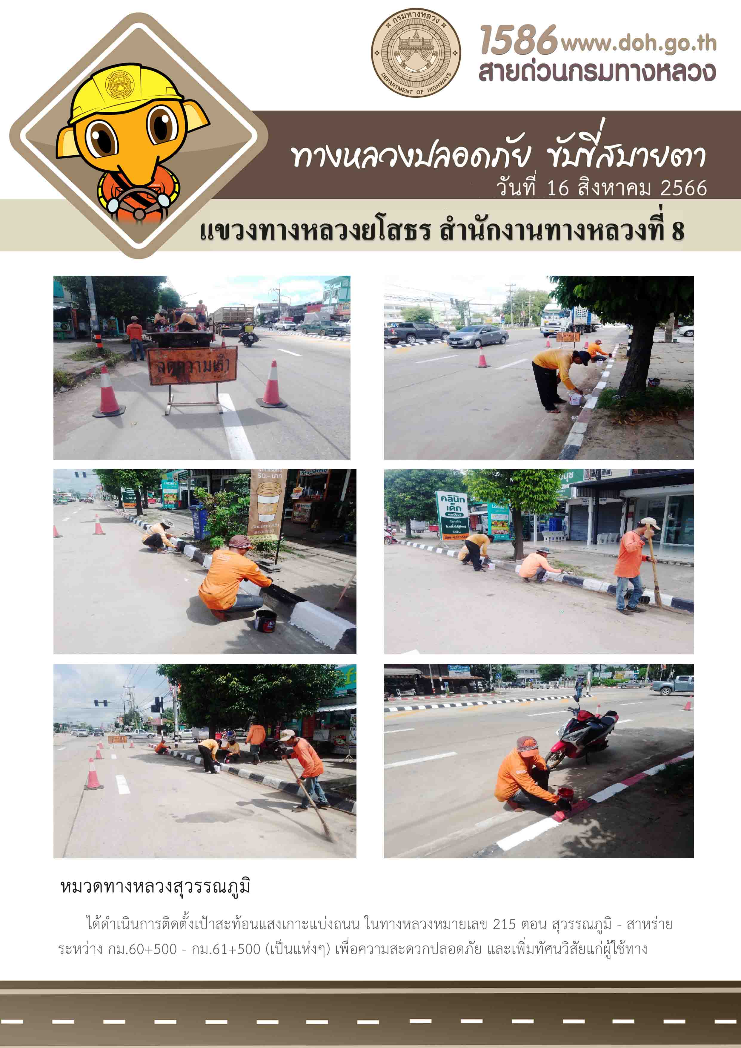 วันที่ 16 สิงหาคม 2566 หมวดทางหลวงสุวรรณภูมิ ได้ดำเนินการติดตั้งเป้าสะท้อนแสงเกาะแบ่งถนน ในทางหลวงหมายเลข 215 ตอน สุวรรณภูมิ - สาหร่าย ระหว่าง กม.60+500 - กม.61+500 (เป็นแห่งๆ) เพื่อความสะดวกปลอดภัย และเพิ่มทัศนวิสัยแก่ผู้ใช้ทาง