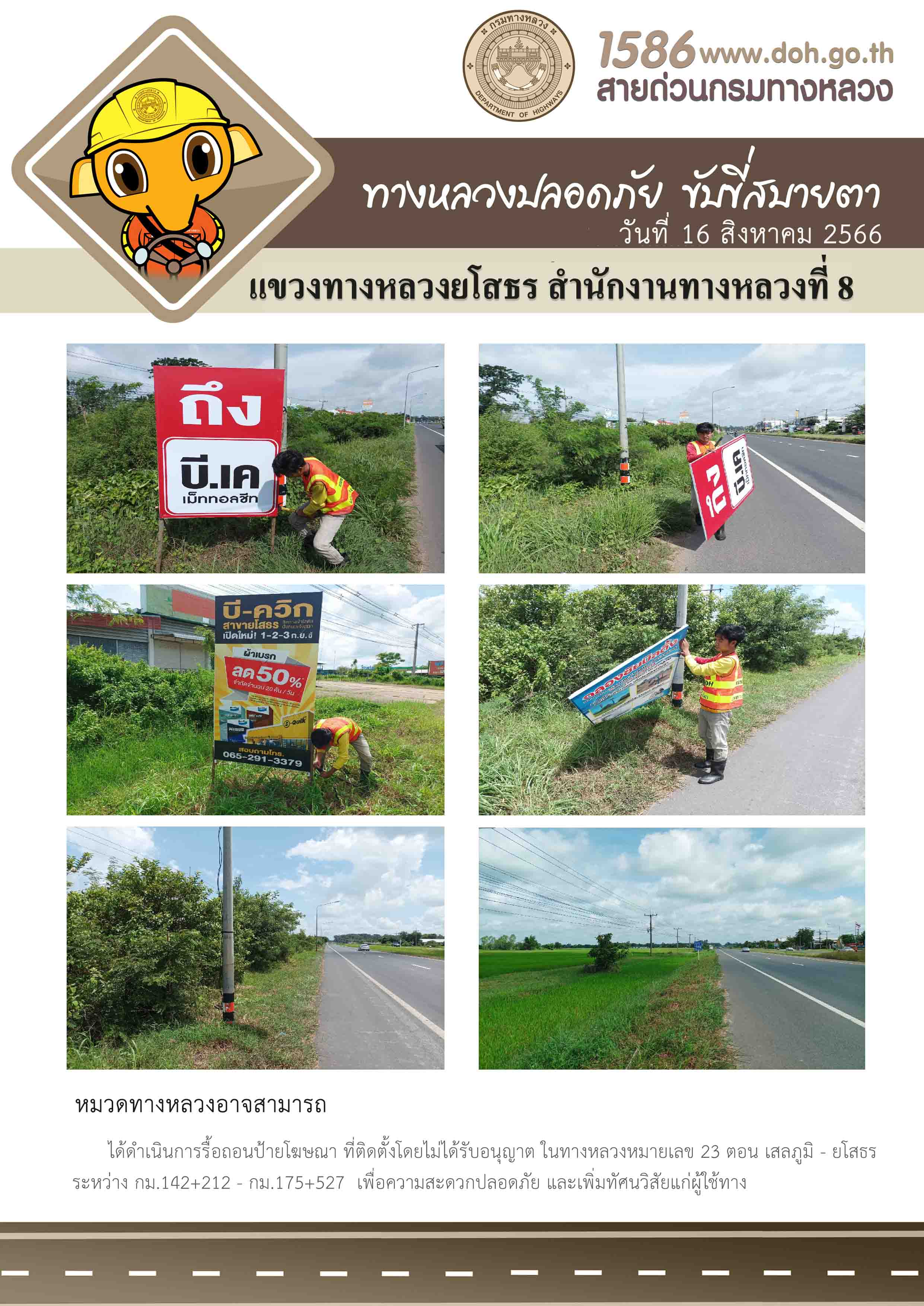 วันที่ 16 สิงหาคม 2566 หมวดทางหลวงอาจสามารถ ได้ดำเนินการรื้อถอนป้ายโฆษณา ที่ติดตั้งโดยไม่ได้รับอนุญาต ในทางหลวงหมายเลข 23 ตอน เสลภูมิ - ยโสธร ระหว่าง กม.142+212 - กม.175+527 เพื่อความสะดวกปลอดภัย และเพิ่มทัศนวิสัยแก่ผู้ใช้ทาง