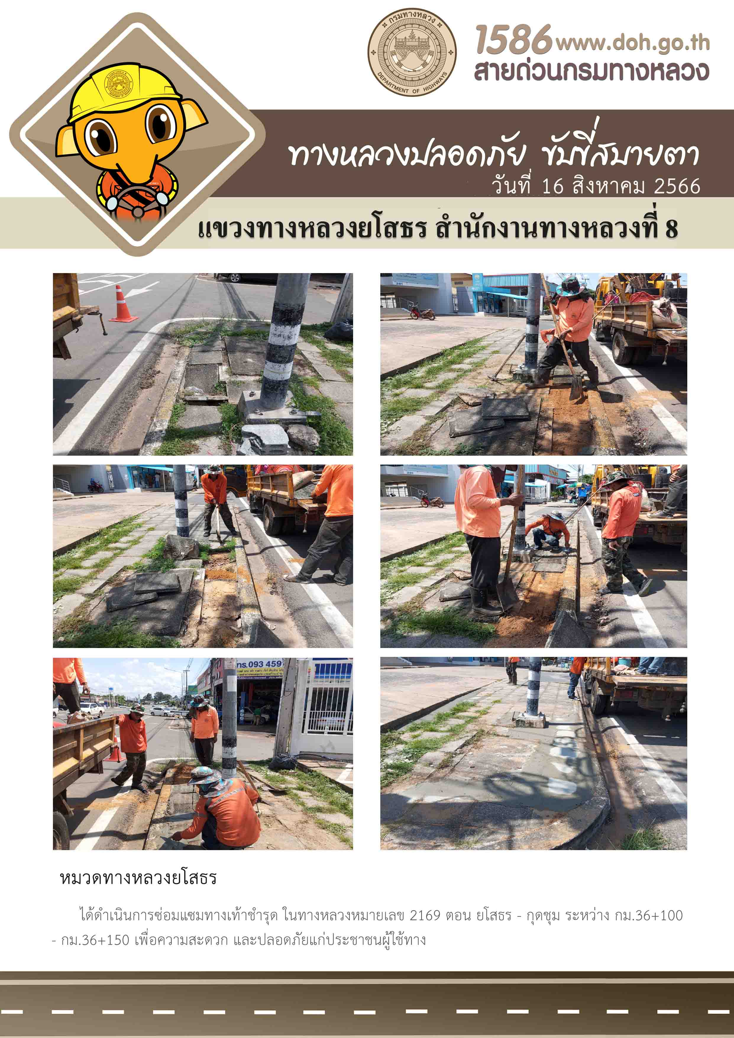วันที่ 16 สิงหาคม 2566 หมวดทางหลวงยโสธร ได้ดำเนินการซ่อมแซมทางเท้าชำรุด ในทางหลวงหมายเลข 2169 ตอน ยโสธร - กุดชุม ระหว่าง กม.36+100 - กม.36+150 เพื่อความสะดวก และปลอดภัยแก่ประชาชนผู้ใช้ทาง