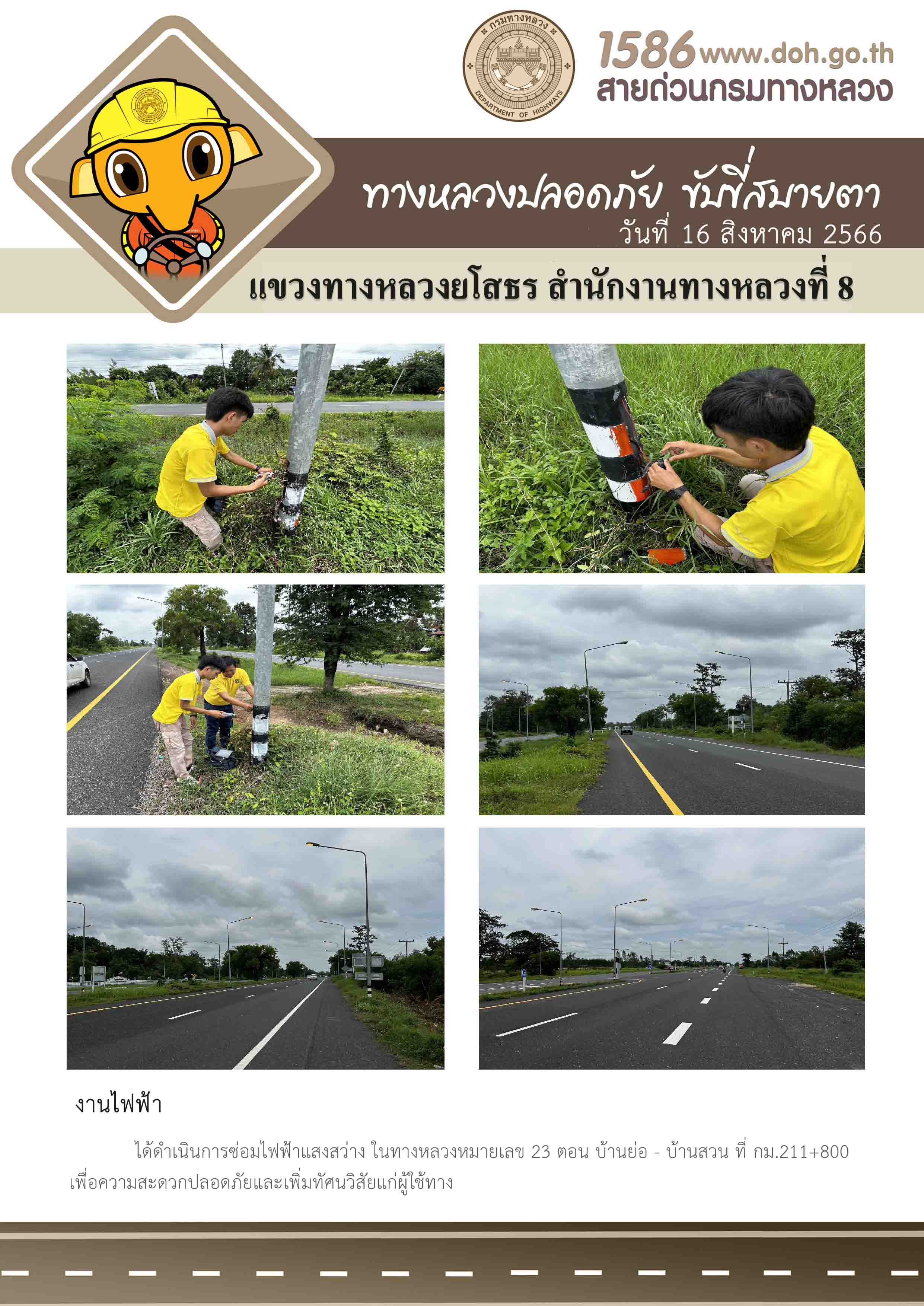 วันที่ 16 สิงหาคม 2566 งานไฟฟ้า ได้ดำเนินการซ่อมไฟฟ้าแสงสว่าง ในทางหลวงหมายเลข 23 ตอน บ้านย่อ - บ้านสวน ที่ กม.211+800 เพื่อความสะดวกปลอดภัยและเพิ่มทัศนวิสัยแก่ผู้ใช้ทาง