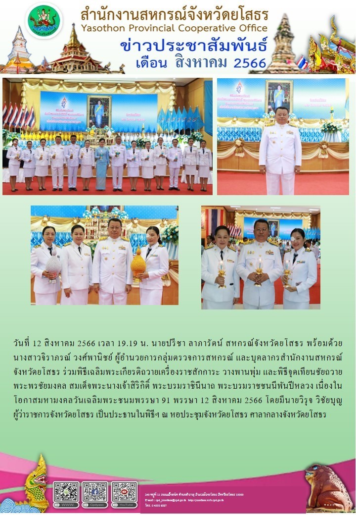 นายปรีชา ลาภารัตน์ สหกรณ์จังหวัด พร้อมด้วยนางสาวจิราภรณ์ วงศ์พานิชย์ ผู้อำนวยกลุ่มตรวจการสหกรณ์ ร่วมพิธีเฉลิมพระเกียรติถวายเครื่องราชสักการะวางพานพุ่ม และพิธีจุดเทียนชัยถวายพระพรชัยมงคล สมเด็จพระนางเจ้าสิริกิติ์ ฯ ณ ห้องประชุมจังหวัดยโสธร