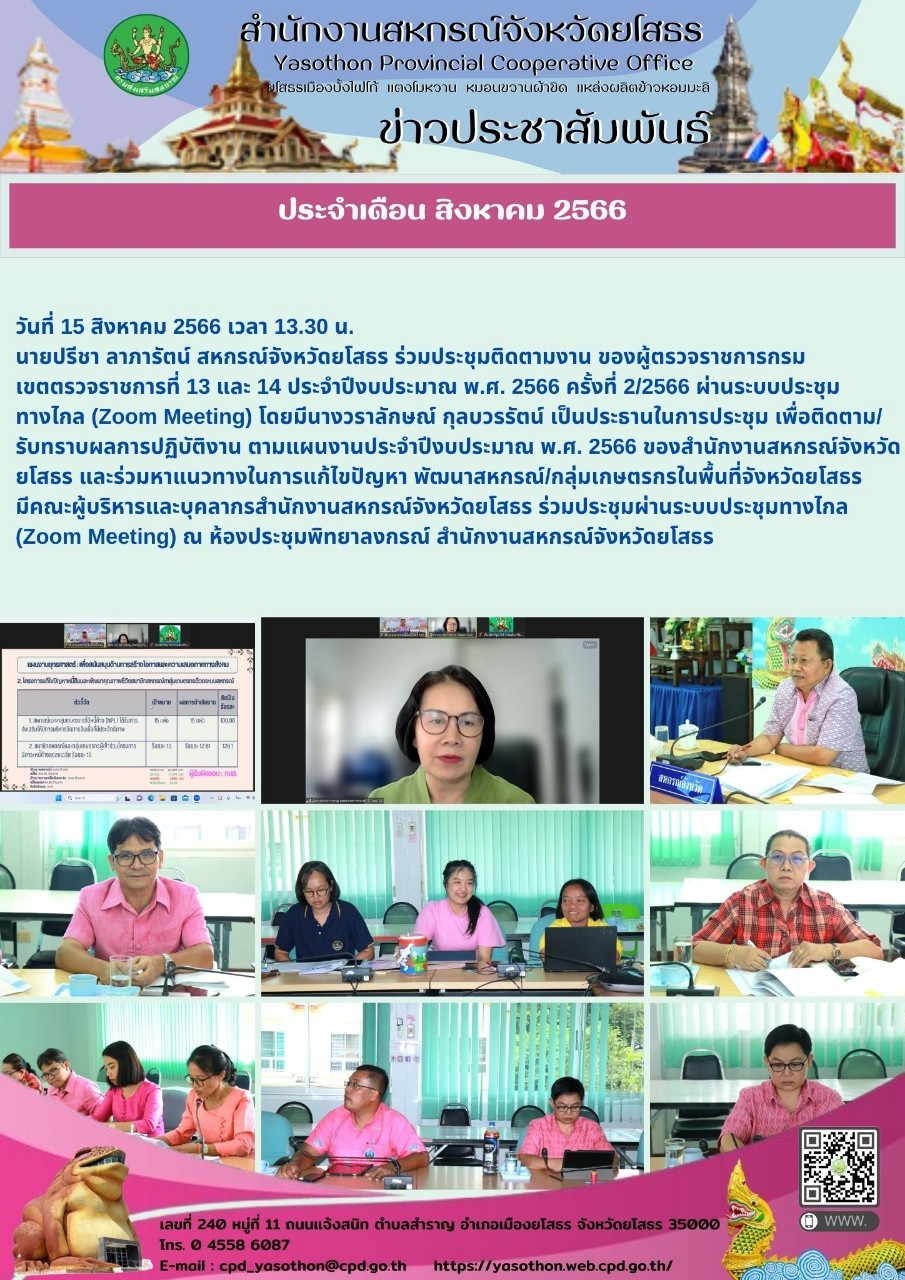 นายปรีชา ลาภารัตน์ สหกรณ์จังหวัดยโสธร ร่วมประชุมติดตามงานของผู้ตรวจราชการกรมเขตตรวจราชการที่ 13และ 14 ประจำปีงบประมาณพ.ศ.2566 ครั้งที่2/2566 ผ่านระบบ Zoom Meeting ณ ห้องประชุมพิทยาลงกรณ์ สำนักงานสหกรณ์จังหวัดยโสธร